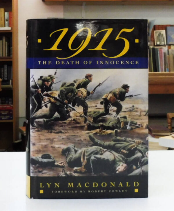1915: The Death of Innocence, MacDonald, Lyn, Cowley, Robert (foreword). Published by Henry Holt, U.S.A., 1994. First Edition/First printing. 8vo up to 9½” tall. 625 pages including photos, maps, bibliography and index. Blue cloth spine, black boards, gilt spine titles. Unclipped jacket in fine condition; volume in unread condition; tiny glue mark free endpaper; no other markings.