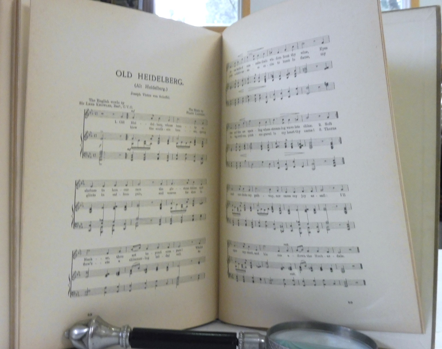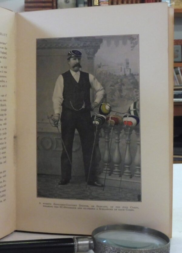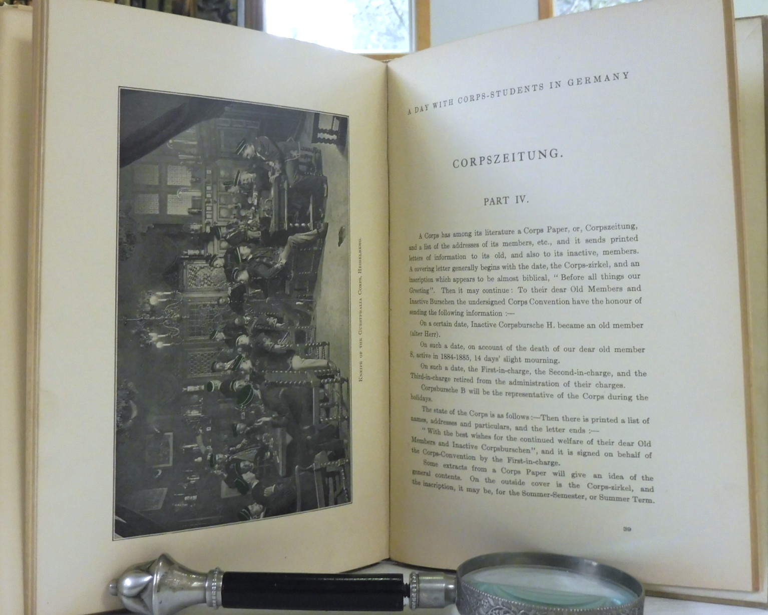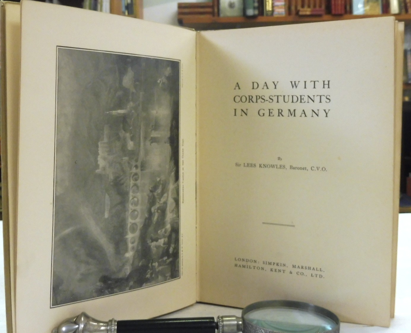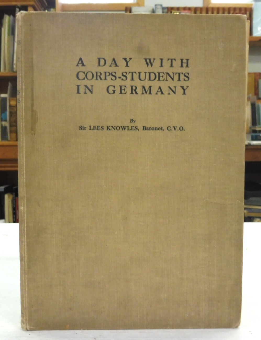 A Day with Corps-Students in Germany, Knowles, Lees, Bart. Published by Simpkin, Marshall, Hamilton, Kent and Co., London, 1913. 4to – over 9¾” – 12″ tall; 55pp. (unpaginated); photographs, and music scores. Beige cloth boards with black titles. Contents are in fine condition; boards have light age wear.