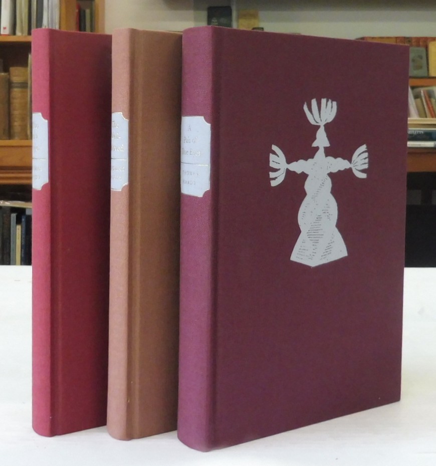 A Pair of Blue Eyes, The Well Beloved, Two on a Tower, Thomas Hardy. Published by The Folio Society, 1992. Three volumes. 8vo up to 9½” tall. Cloth boards with gilt spine titles on label; blocked illustrated figure to front boards; mapped endpapers; blue top edge; wood engraved illustrations by Peter Reddick. Housed in a matching slipcase. In fine, unread condition; very light shelf wear to slipcase.