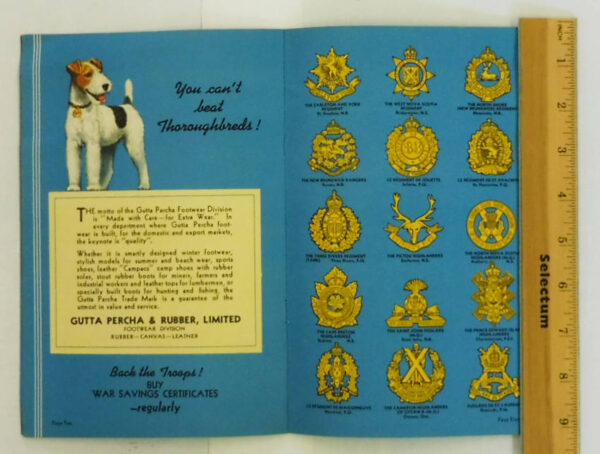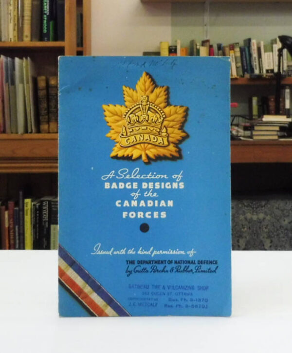 “A colourful 16 page booklet illustrating 160 Cap Badges of the Canadian Forces” (newspaper advertisement: Canadian Stateman, Bowmanville, Ontario P.7 May 29, 1941). The booklet was intended as a “know-me-better gift” with “limited number available” from local dealers. This copy has a blue inked stamp lower front cover of an Ottawa tire shop. Includes several reminders to: “Back the Troops! BUY WAR SAVINGS CERTIFICATES – regularly.”. In very good condition with name front top edge, light cover wear; pages are clean without tears, folds or marks. 3505 $20