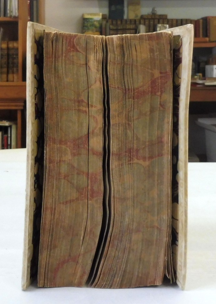 Archaeologia Graeca, or the Antiquities of Greece, Potter, J. Published by Stirling & Kenney; Longman, Hurst, Rees, Orme, Brown, & Green et al, Edinburgh, 1832. Two volumes in one. 12mo up to 8½” tall., 832pp. [15] + 544 and [4] + 555 pp, illustrated, folding map, index. Vellum boards with gilt borders, marbled endpapers, all edges marbled, reinforced hinges. Light water staining to fore edge pages 40-44 and otherwise contents are without tears, folds or marks; pages lightly waved. Boards lightly splayed with light wear; stain to lower rear board and spine. A lovely copy in very good condition.