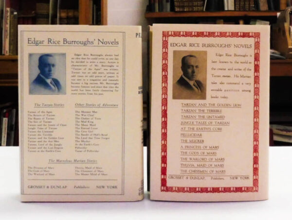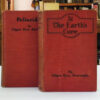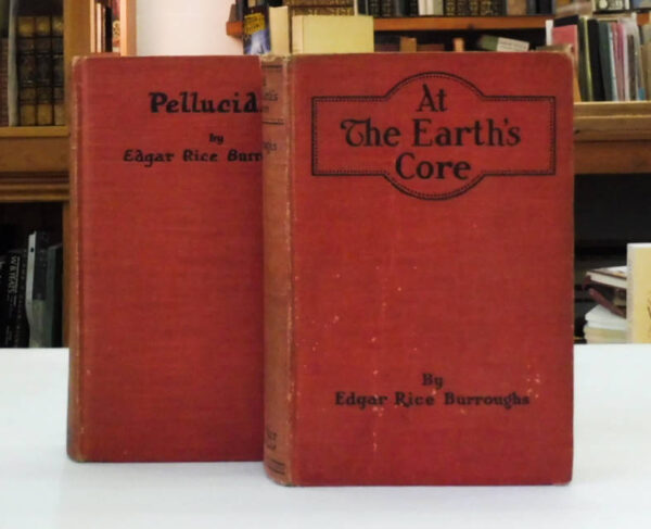 At the Earth’s Core, Burroughs, Edgar Rice; Illustrated by J. Allen St. John. Published by Grosset & Dunlap, New York, 1922. Printed in the same year as the first A.C. McClurg & Co edition. 8vo up to 9½” tall., 277pp. with 8 black and white plates including frontispiece. Red cloth boards with black titles front and spine. In good condition with names to front and rear endpapers; crease to front board, fraying to head of spine, light spine lean. In facsimile Grosset dustjacket.