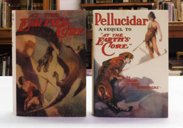 Pellucidar A Sequel to At The Earth’s Core, Burroughs, Edgar Rice; Illustrated by J. Allen St. John. Published by Grosset & Dunlap, New York, 1923. 8vo up to 9½” tall., 322 pp. with four black and white plates including frontispiece. Red cloth boards with black titles front and spine. Name and blind embossed stamp to front endpaper and otherwise volume is in very good condition both internally and externally. In facsimile Grosset dustjacket.