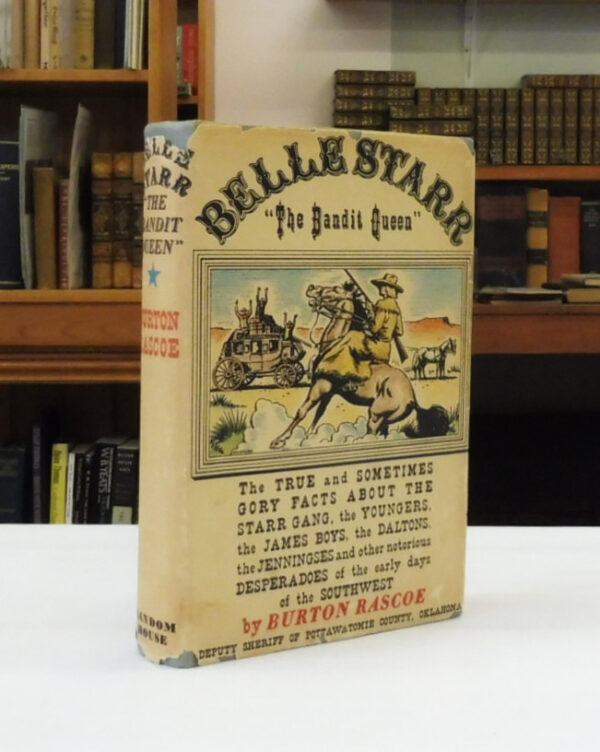 Belle Starr “The Bandit Queen”, The True Story of the Romantic and Exciting Career of the Daring and Glamorous Lady Famed in Legend and Story Throughout the West, Rascoe, Burton, Deputy Sheriff of Pottawatomie county, Oklahoma. Published by Random House, New York, 1941. First Edition/Stated First printing. 340 pages including a chronology and necrology from 1837 to 1924, a glossary of Western terminology, an extensive annotated bibliography plus index. Frontispiece of Belle Starr and 12 additional black and white illustrations and photographs. Gray cloth boards with red titles front and gilt titles blocked in red to spine, top edge stained red. Light soiling to endpapers and outside edges; text block fine without markings, tears, folds and pages remain bright. Light spine lean; binding and boards otherwise fine. Unclipped jacket has chips and tears and back flap is partially separated at hinge line.