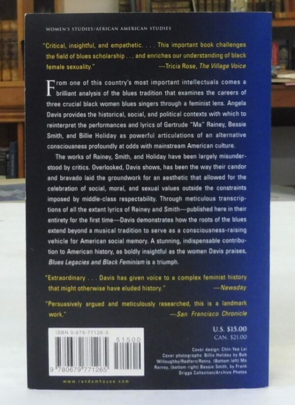 Blues Legacies and Black Feminism: Gertrude Ma Rainey, Bessie Smith, and Billie Holiday, Davis, Angela Y. Published by Vintage, 1998. Card covers. Signed by Angela Davis on versus of front cover. 8vo – over 7¾” – 9¾” tall. 427pp., illustrations. Contents in fine, unread condition; covers have the lightest of shelf wear.