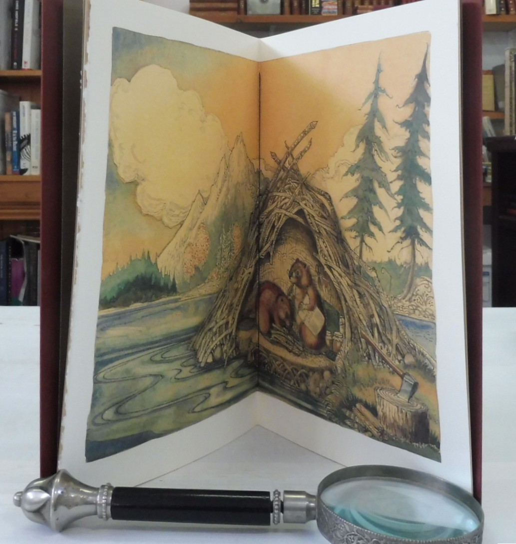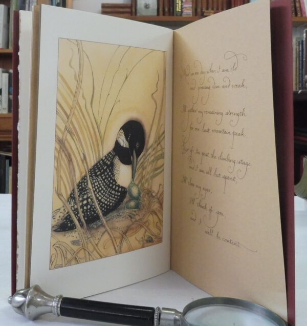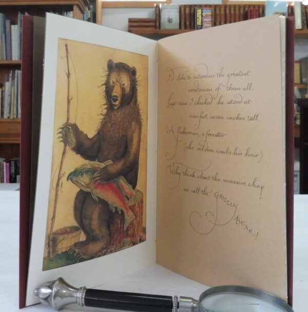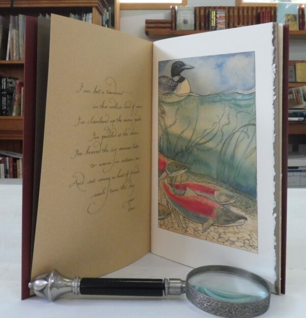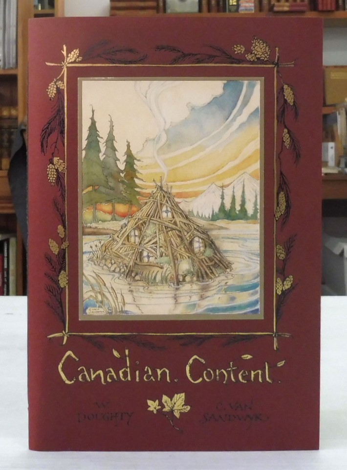 Canadian Content, Charles Van Sandwyk. Waisiki Doughty. Published by Charles van Sandwyk Fine Arts, Vancouver, 2009. 4to – over 9¾” – 12″ tall., [24pp.], unpaginated. Pictorial card covers, French flaps, hand-stitched binding. Introduction by Waisiki Doughty presented in a folded tipped in letter. Calligraphic text with full water color illustrations of animals, plants, and birds. Inscription to top edge of title page and otherwise, in fine condition