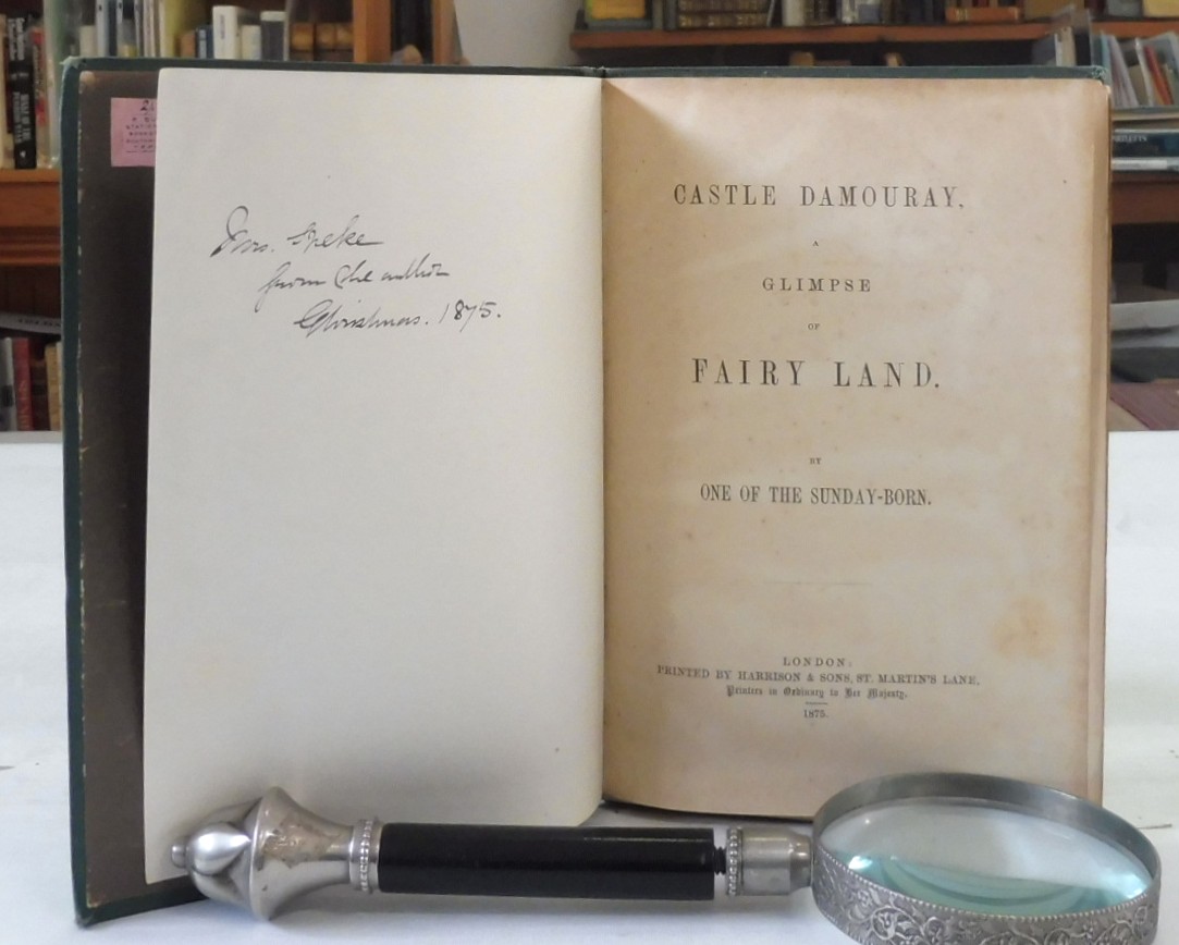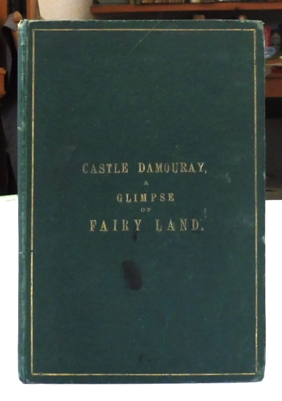 Castle Damouray, a Glimpse of Fairy Land, by One of the Sunday-Born Joseph Jackson. Published by Harrison, Printers in ordinary to Her Majesty, 1875. First Edition. 12mo up to 8½” tall., 55pp. Green cloth borders with gilt borders, gilt titles, all edges gilt, brown endpapers, sewn hinges. Tiny booksellers label to pastedown, written inscription dated 1875 to versus of free endpaper, moderate page toning, hinges lightly weakened. Black ink spots to front boards and rubbing to edges. A very rare copy with no other copies found at time of listing.