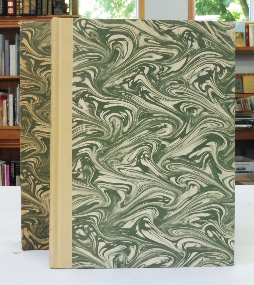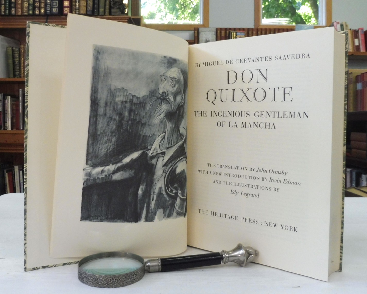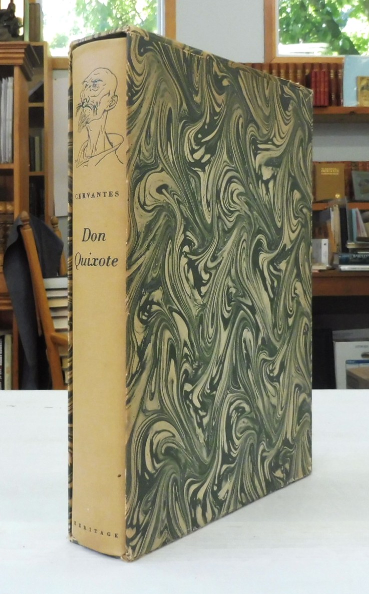 Don Quixote: The Ingenious Gentleman of La Mancha, Miguel de Cervantes Saavedra. Published by Heritage Press, NY, 1950. 4to – over 9¾” – 12″ tall; 682pp., illustrated throughout by Edy Legrand. Translation by John Ormsby, with a new introduction by Irwin Edman. Quarter light yellow cloth over marbled green boards, housed in a matching slipcase. Volume is in fine, unread condition; slipcase has light age toning and shelf wear.