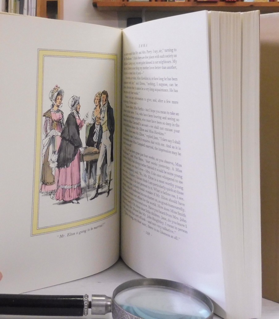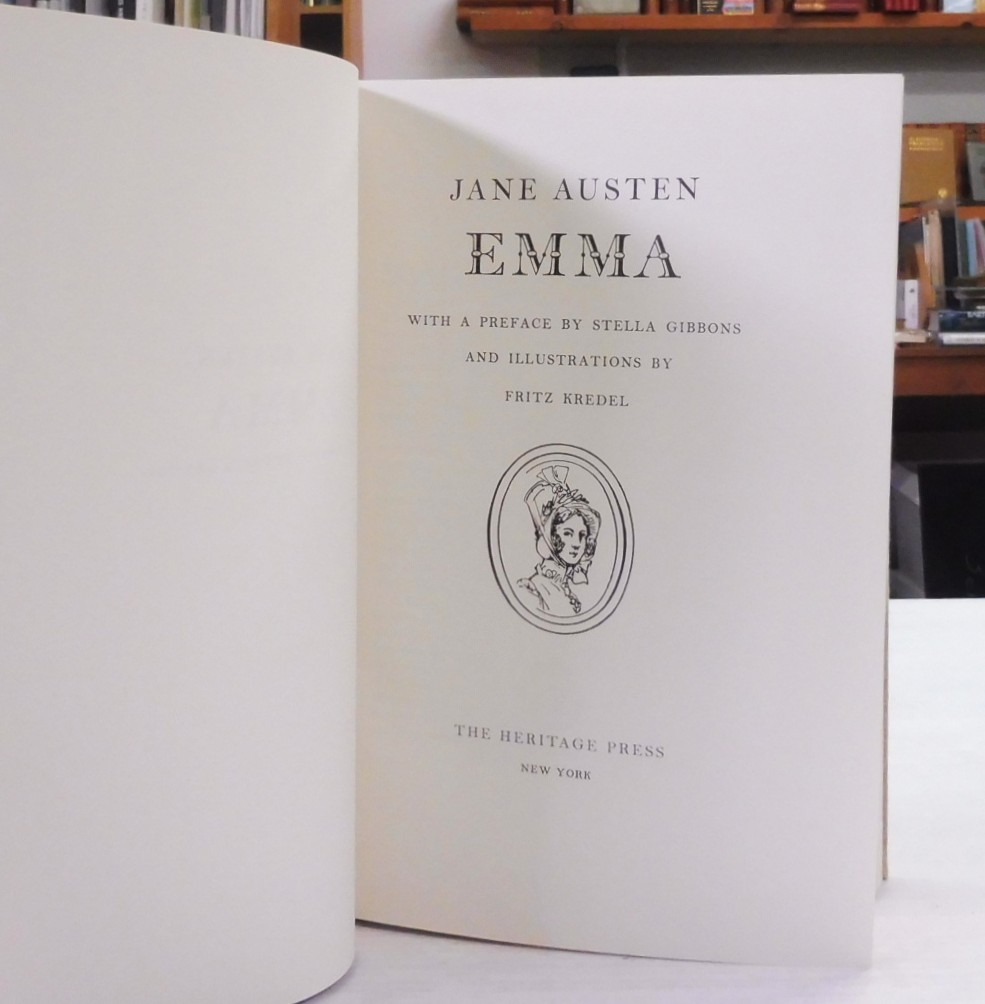 Emma, Jane Austen; Preface by Stella Gibbons; Illustrations by Fritz Kredel. Published by Heritage Press, Norwalk, Connecticut, 1964. 8vo up to 9½” tall. 427pp. illustrated. Patterned cloth boards. Light rubbing to spine title label and otherwise in fine, unread condition. Lacks slipcase.