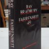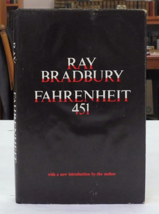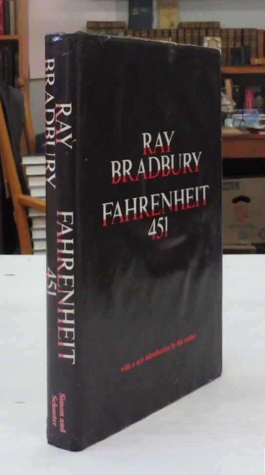 Fahrenheit 451, Ray Bradbury. Published by Simon & Schuster, 1967. Book Club Edition. 8vo up to 9½” tall., 187pp. Black boards with red titles, red top edge. Book seller’s stamp to free endpapers, small printed name, red top edge is faded. Rubbing to edges of jacket and light waviness front panel. In very good condition.