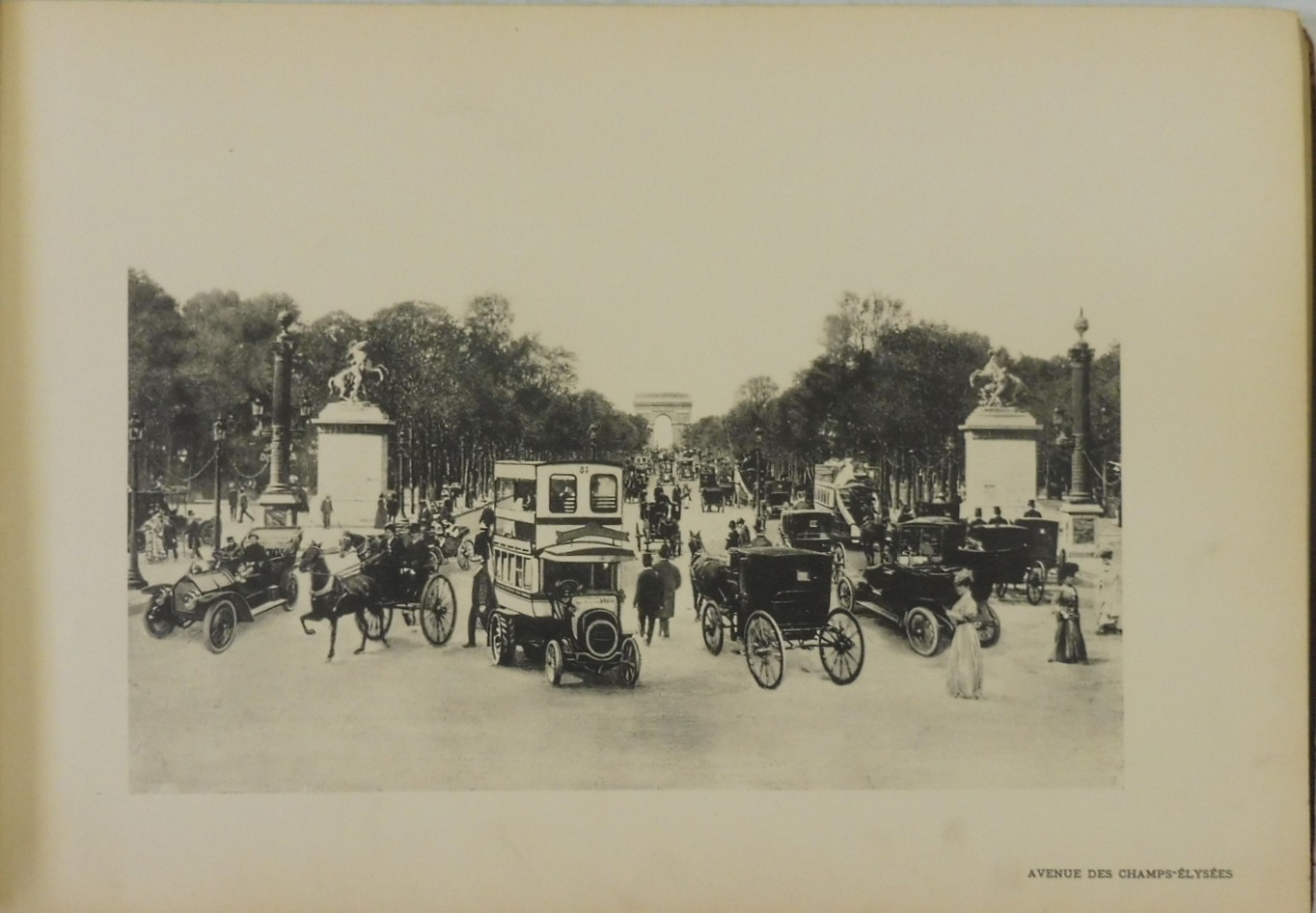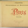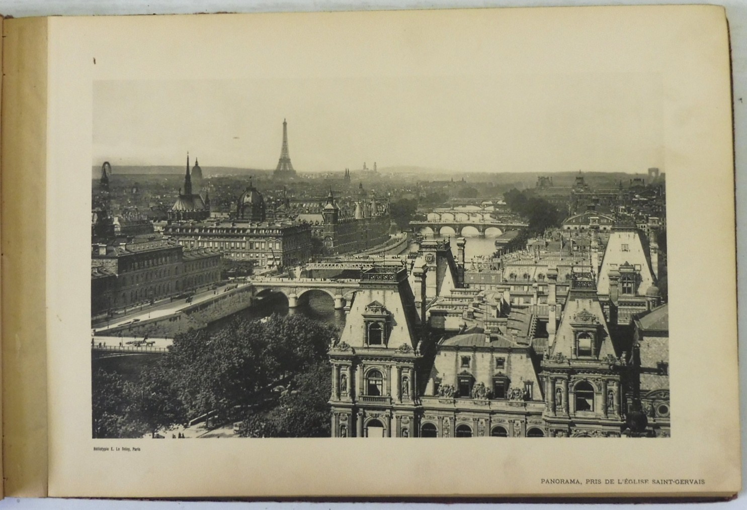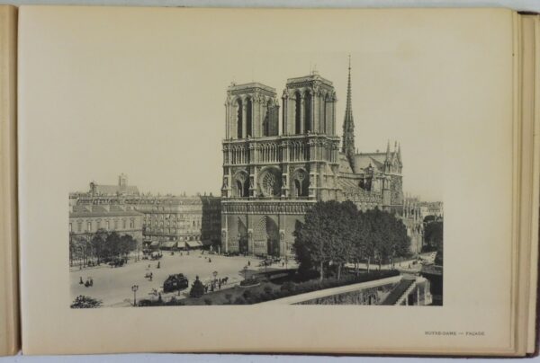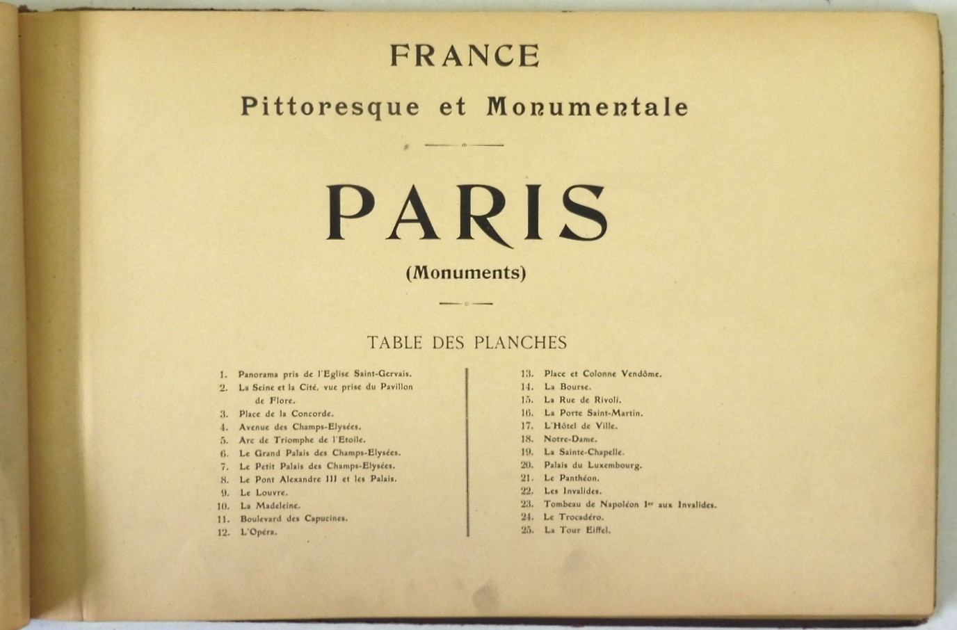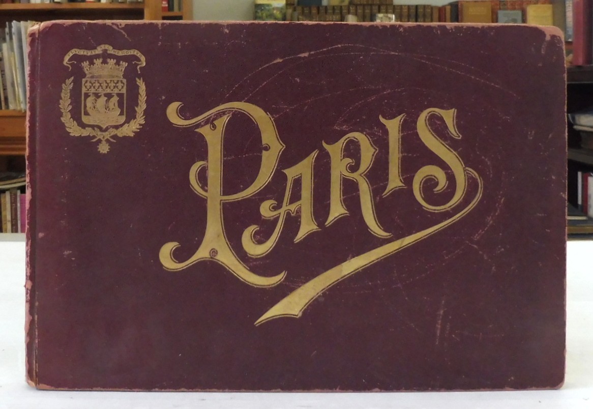 France Pittoresque et Monumentale Paris, Published by E. Le Deley, 73, Rue Claude-Bernard, Paris. Circa 1900. Photo album. 4to – over 9¾” – 12″ tall. Title, List of Plates; 25 heliotypes (a high-quality photographic printing process) showcasing notable Parisian landmarks and monuments. Crimson boards with gilt title. Toning to title and contents, light toning to plates; one plate detached but present; hinges weak; wear to boards.
