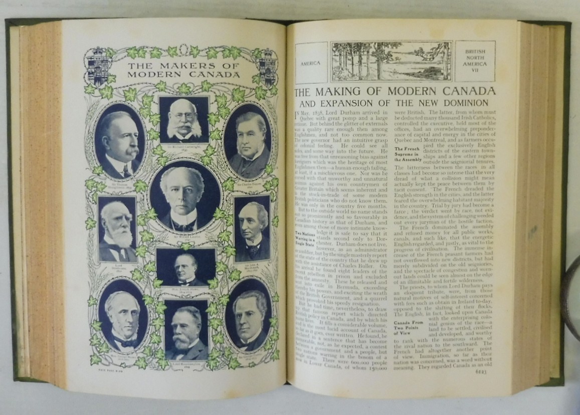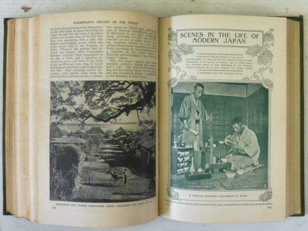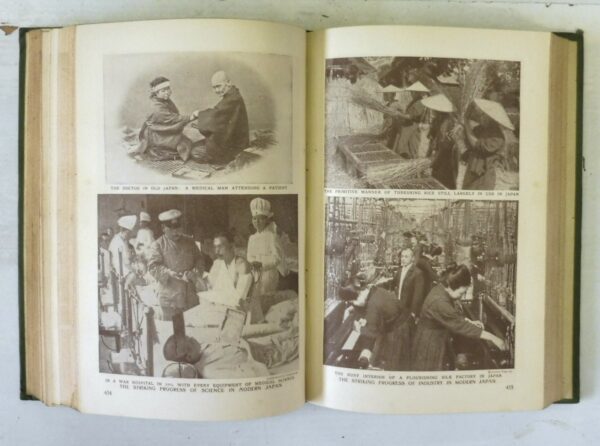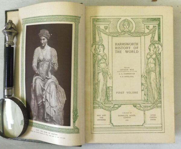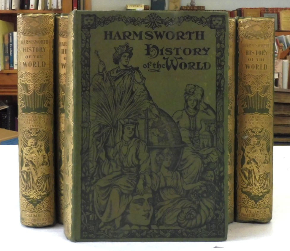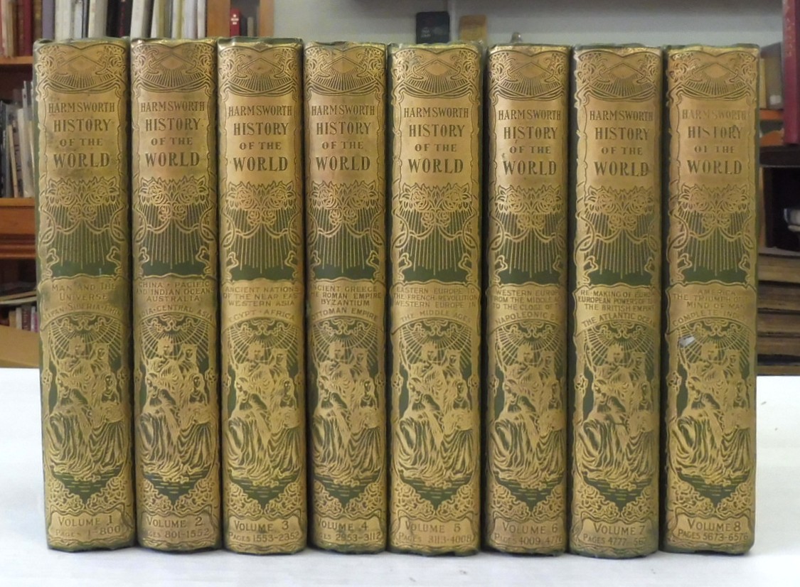 Harmsworth History of the World, Arthur Mee. Published by Carmelite House, London, 1907. First Edition. 8 Volumes complete. Green cloth bindings with decorative spines. Contains colour and black-and-white photographs, illustrations, maps, plans and diagrams. In very collectible condition. A comprehensive, Edwardian-era survey known for its sweeping, accessible narrative and extensive illustrations. It provides a popular view of global history, featuring over 7,000 pages, colored maps, and artistic plates.
