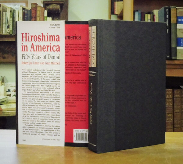 Hiroshima in America: Fifty Years of Denial, Lifton, Robert Jay; Mitchell, Greg, Grossett/Putnam, U.S.A., 1995. First Edition/First printing. 8vo – over 7¾” – 9¾”, 425 pages including index and appendix that discusses the images of Hiroshima in film and books. Black boards, silver spine titles, red endpapers. Both unclipped jacket and volume in fine condition and likely unread. 002487  $15