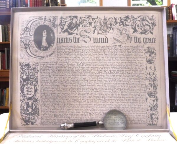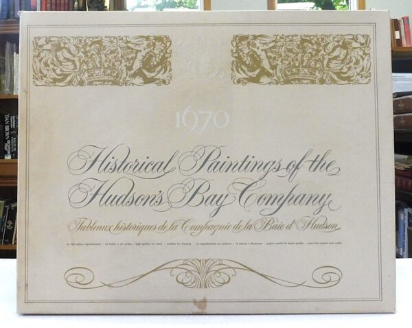 Historical Paintings of the Hudson’s Bay Company. Published by Hudson’s Bay Company, Winnipeg, 1970. Complete boxed set of 14 lithographic prints on high quality thick art stock. Hinged box is 21.75 x 16.75 inches and the plates are 20 x 18 inches (50.8 x 40.6 cm). A reproduction of the first page of the HBC’s charter is printed inside the lid. Descriptions of the prints are bilingual (English and French) and explains the events and persons depicted; each print is bilingually captioned. Individual prints can be framed. Plates are each in fine condition; box is structurally fine with light toning, a small soil mark to front panel and rubbing to rear.