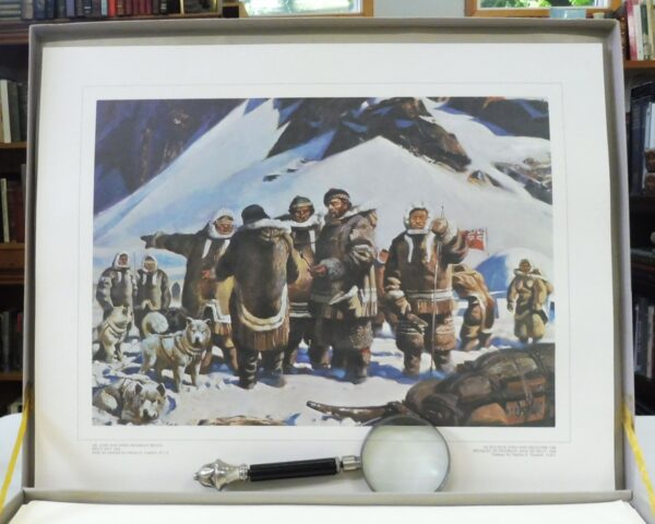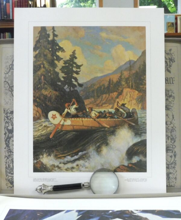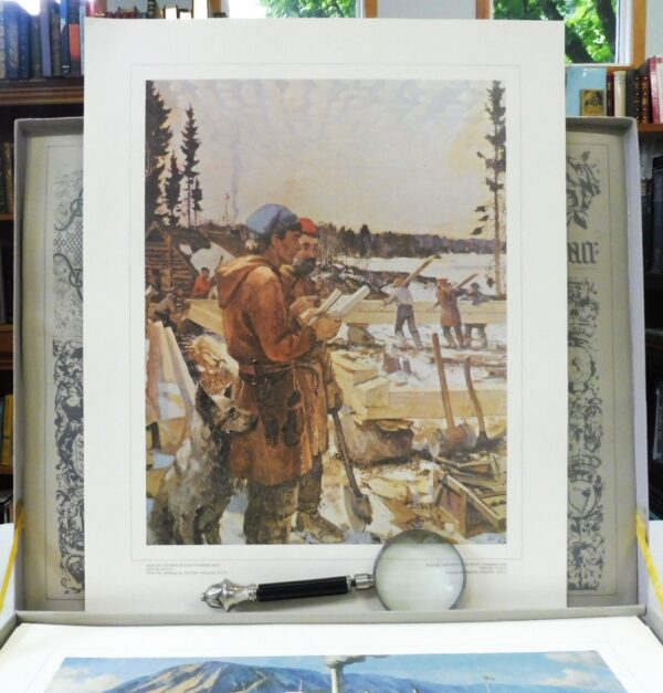 These are reproductions of paintings which were specially commissioned for the Company’s calendar art beginning in 1912. The scenes depict events and people who were important to the history of the Hudson’s Bay Company. The original paintings are by well-known Canadian and British artists created between 1669 & 1942. The box set was produced in 1970 in a run of 10, 000 copies to celebrate the Company’s 300 years of history. Many of the portfolio prints were broken up and sold as individual prints on the secondary market and complete sets are becoming scarce.