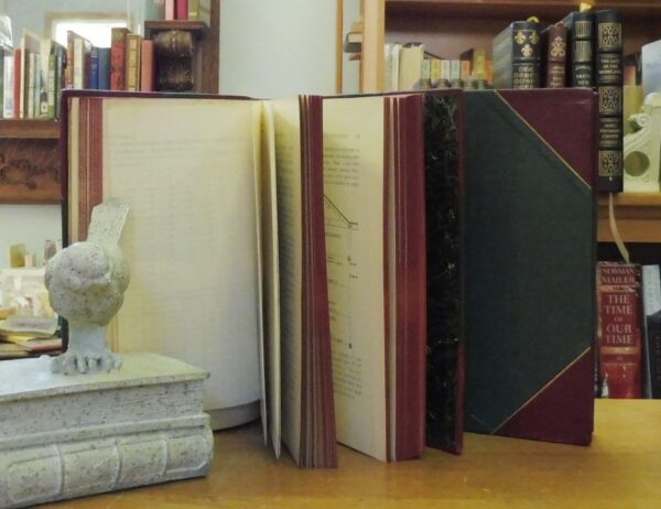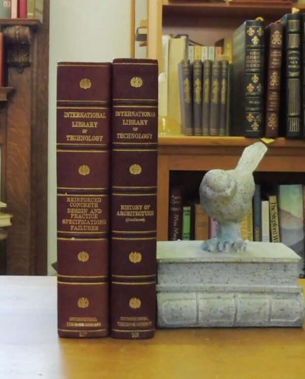 History Of Architecture, Volumes 100 And 101 International Library Of Technology International Textbook Company, Scranton, Pennsylvania, 1909. Volume 100 Titled: Painting And Interior Decoration; History Of Architecture And Ornament; Volume 101 Is Titled: History Of Architecture Continued. Red half leather binding and green cloth, gilt spine titles and to covers back and front. Red edges. Marbled endpapers, black and white and full color illustrations, diagrams, tables, index. Volume one has a brown stain from pressed in flowers on page 162-163. Both volumes have minor spotting inside free front endpapers and a small inked stamped number to title page; otherwise interiors are clean and bright. Very good plus condition. Rare to find both volumes as one set. Includes a laid in paper bookmark from the publisher with instructions on how to open a new book 000476. $90