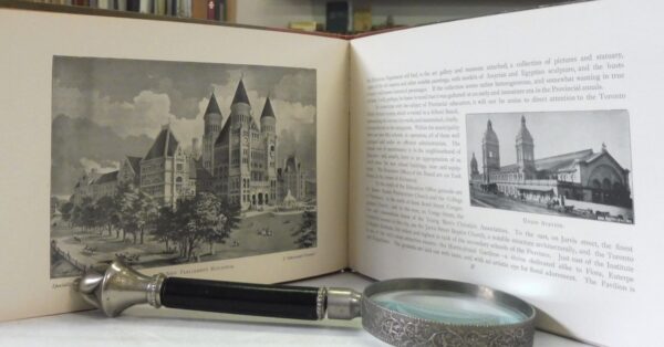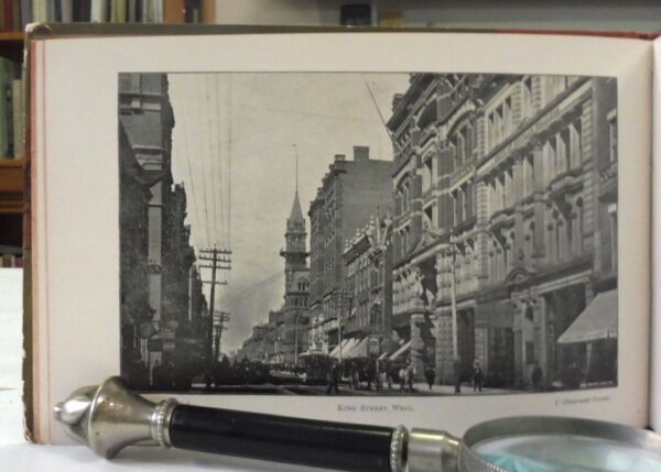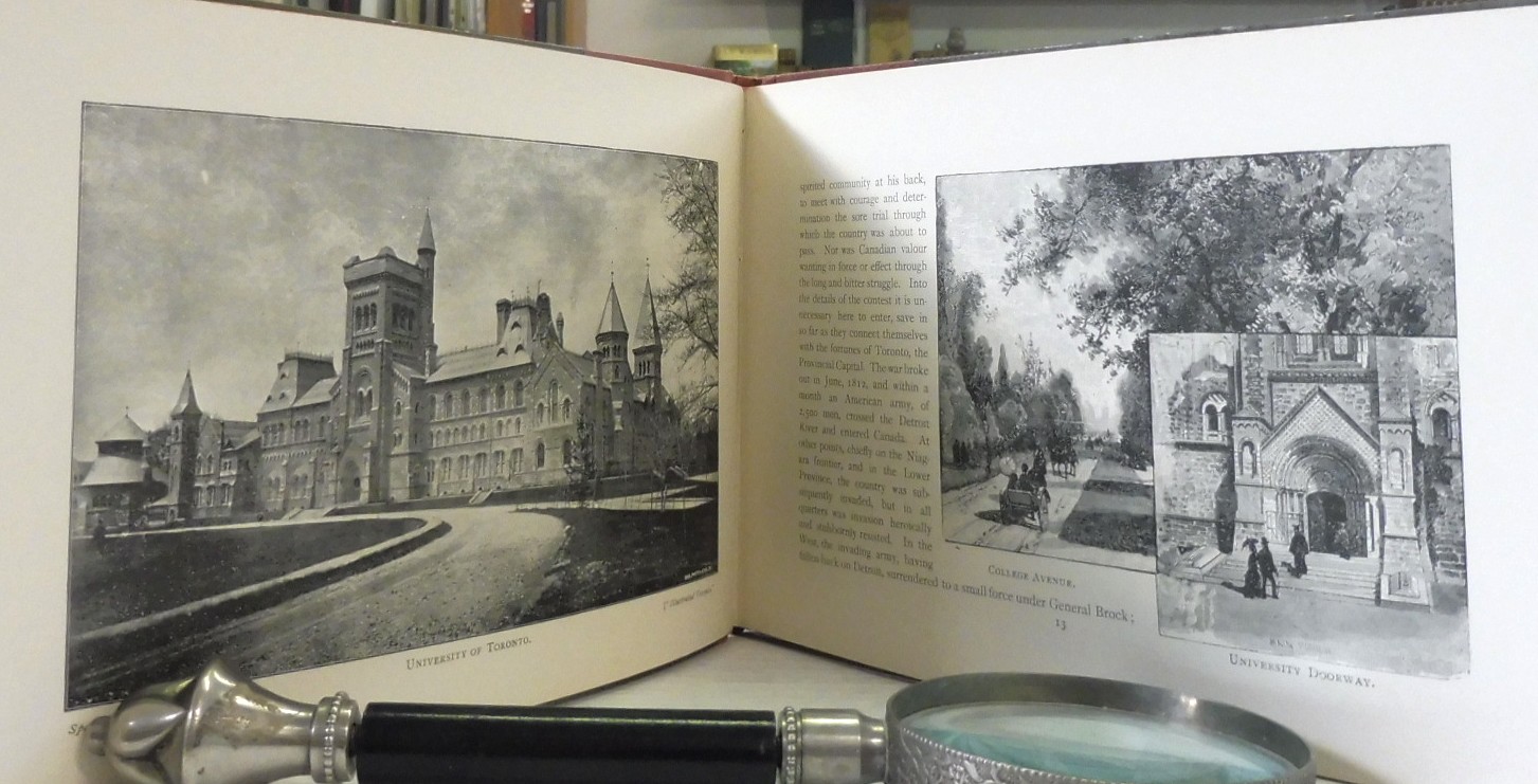 Illustrated Toronto: The Queen City of the West, G. Mercer Adam. Published by J. McConniff, Montreal, 1891. First Edition. Tourist Gem Souvenir Book. Brick red cloth with illustrated boards. Oblong 8vo up to 9½” tall., 64pp., black and white photos and engravings. Contents are in fine, unmarked condition; board edges have moderate wear.