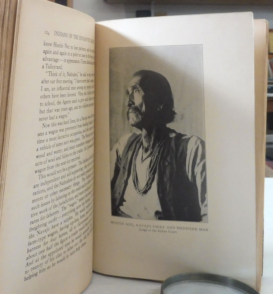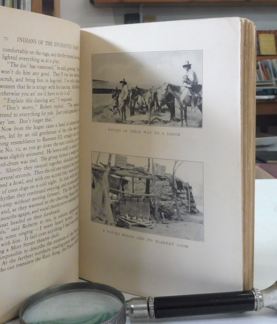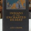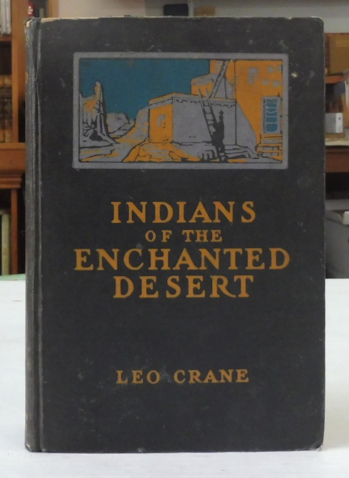 Indians of the Enchanted Desert, Crane, Leo. Published by Little Brown, Boston, 1927. Third printing. 8vo up to 9½” tall. pp: x, 364; frontispiece and 52 illustrations from photographs, rear foldout map of Navajo and Hopi Country. Black cloth with blue and orange illustration, orange titles, lettering, top edges gilt. Hinge cracked along title page with all pages holding fast; small booksellers label lower title page; other wise contents are free of markings, tears or folds. Boards have edge rubbing, tiny insect holes and mottling to spine. In good condition.