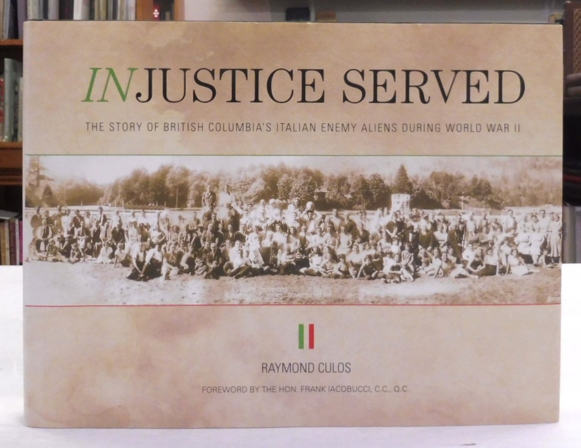 Injustice Served: The Story of British Columbia’s Italian Enemy Aliens During World War II, Culos, Raymond. Published by Cusmano Books, Montreal, 2012. First Edition. Bilingual English/Italian. 4to – over 9¾” – 12″., photographs, index. Foreword by the Hon. Frank Iacobucci, C.C., Q.C. Volume is in fine, unread condition; dustjacket shows the lightest of top edge shelf wear and is otherwise fine.