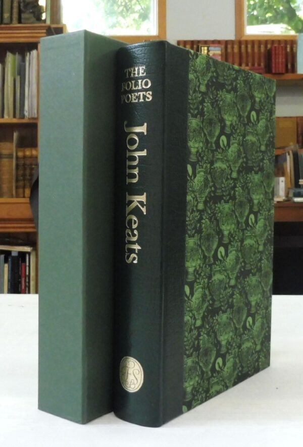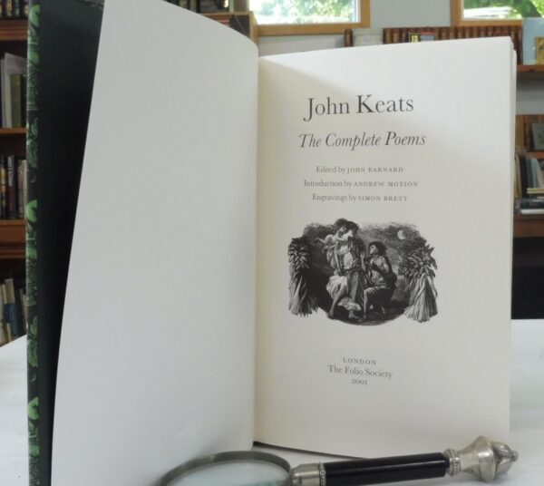 John Keats: The Complete Poems, John Keats. Published by The Folio Society, London, 2001. 4to – over 9¾” – 12″ tall; 472pp. with 76 wood engravings by Simon Brett, index. Edited by John Barnard. Introduced by Andrew Motion. pages. Quarter-bound in dark green leather over patterned boards, green endpapers, green top edge; housed in a green slipcase. In fine, unread condition; slipcase is fine with a bit of sun fading to edges.