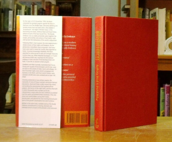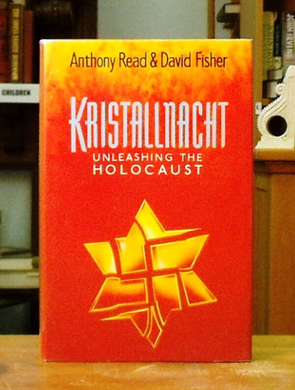 Kristallnacht: Unleashing The Holocaust, Read, Anthony & Fisher, David. Published by Michael Joseph, London, 1989. First Edition. Red boards, gilt spine titles. Volume in pristine condition. Un clipped dust jacket is protected in mylar; small closed tear and chip top spine; otherwise fine. An account of the causes, personalities & actions of the night of November 9/10, 1938 when the Nazis unleashed the greatest Pogrom against the Jews in Germany since the middle ages, dubbing it ‘Kristallnacht’, the night of broken glass. Illustrated with black and white photographs. 001397 $30
