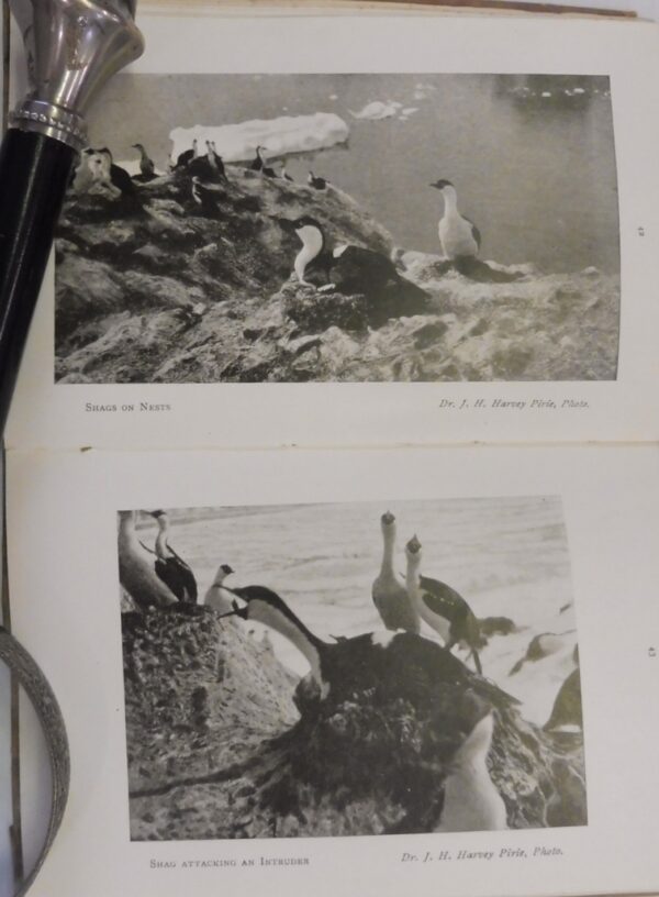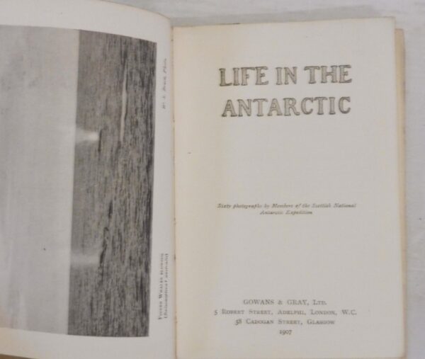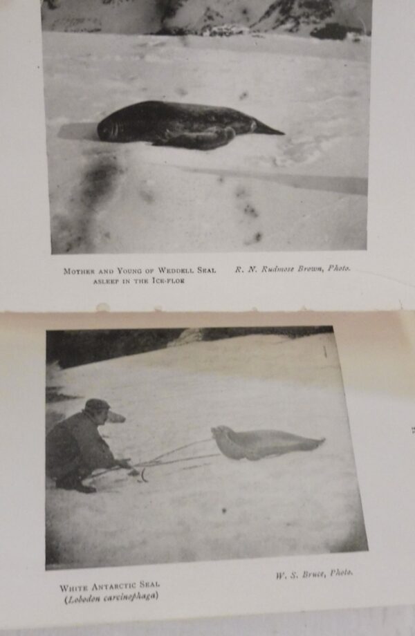 The Scottish National Antarctic Expedition took place from 1902 to 1904. Led by naturalist and polar scientist William Speirs Bruce. The introduction to the book states that many of the mammals and birds shown had never been photographed before this expedition and makes note of the difficult environmental conditions under which these photographs were taken and preserved.