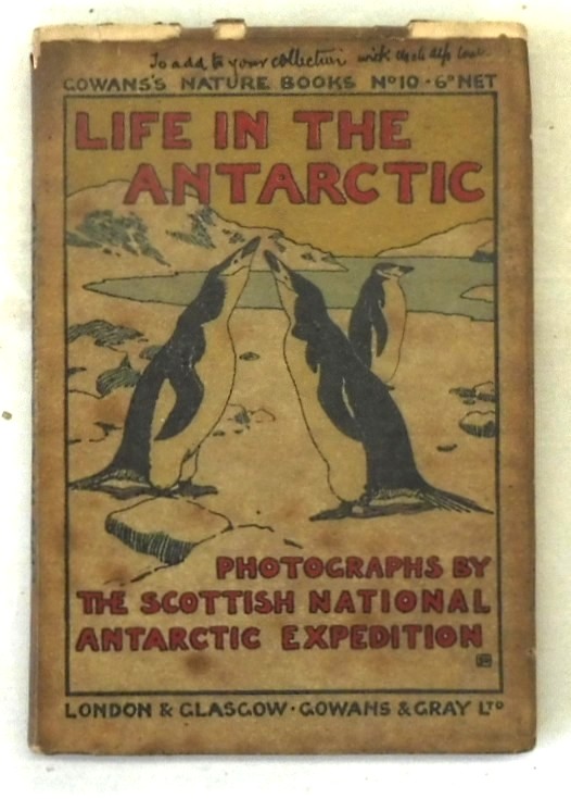Life in the Antarctic. Photographs by Members of the Scottish National Antarctic Expedition, Bruce, William Speirs. Published by Gowans & Gray, London & Glasgow 1907. Gowan’s Nature Books Series, No. 10. Third reprint for a total 15,000 copies. 16mo up to 6½” tall., 8pp. ads; 67pp. plates; 5pp ads. Illustrated paper wraps over plain card covers. Chips and browning to covers; foxing to ads; page7/8 detached; page 9/10 missing. Plates are in very nice condition.