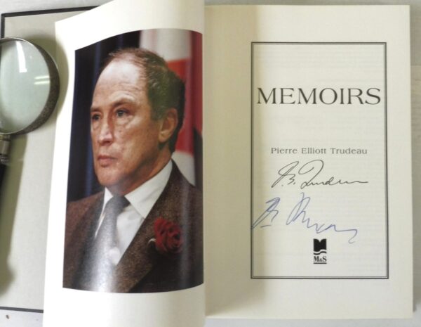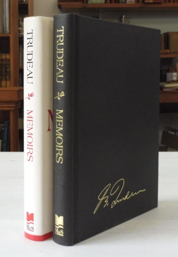 Memoirs, Pierre Elliott Trudeau. Published by McClelland and Stewart, Toronto, 1993. First Edition; First Printing. Signed on title page by Pierre Elliot Trudeau in blue fountain pen. 8vo up to 9½” tall., 379pp., colour frontispiece, illustrated throughout with colour and black and white photographs. Black boards with gilt signature front board, gilt spine titles, gray endpapers. In fine condition.