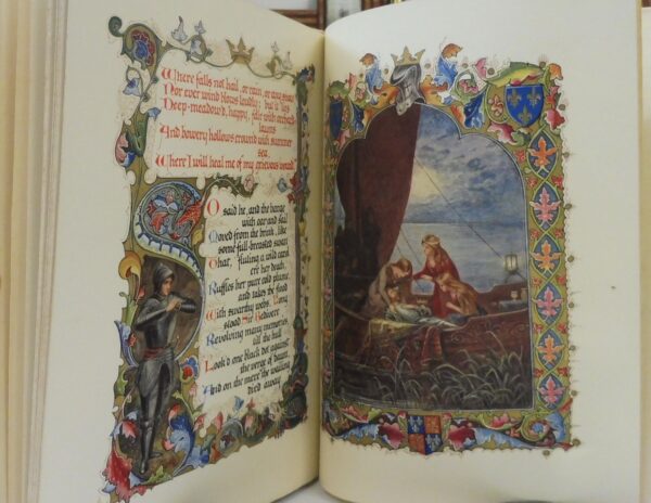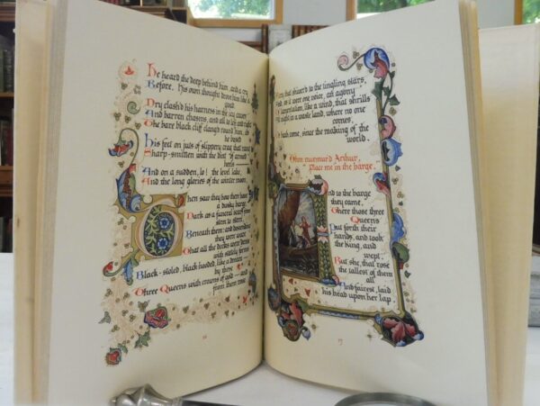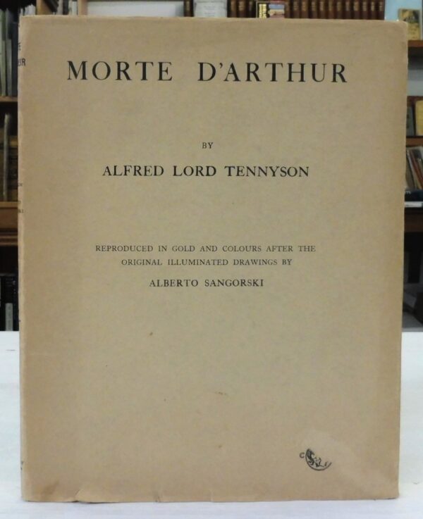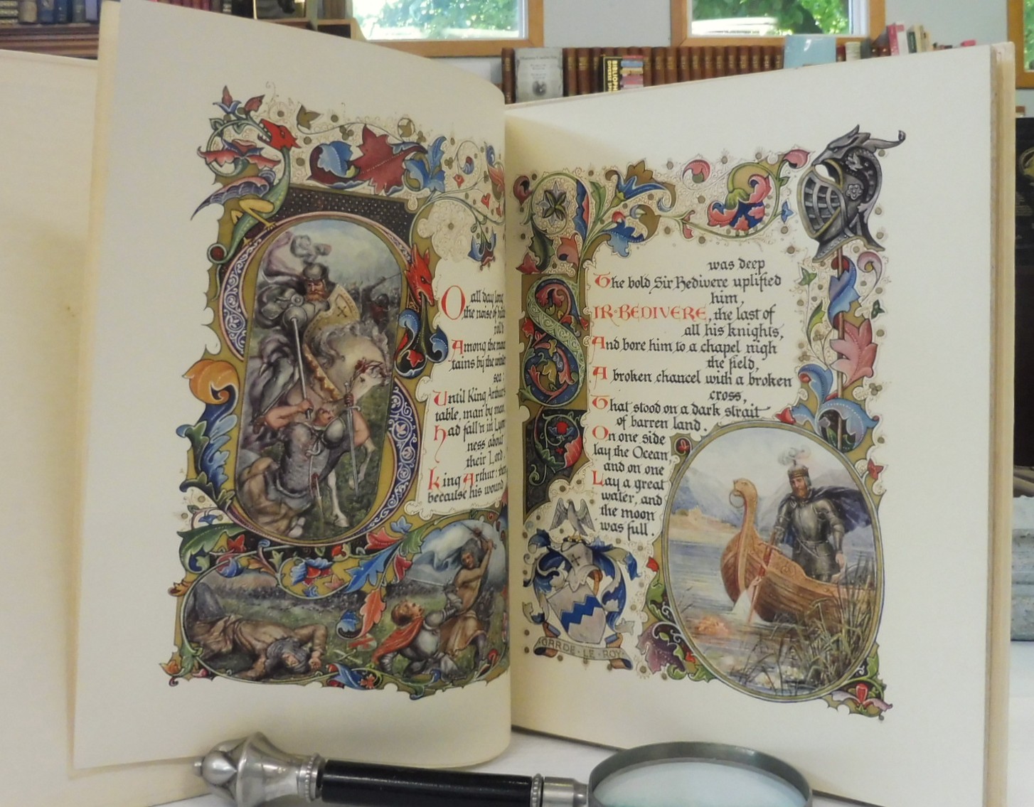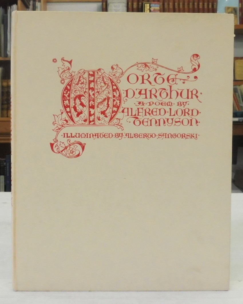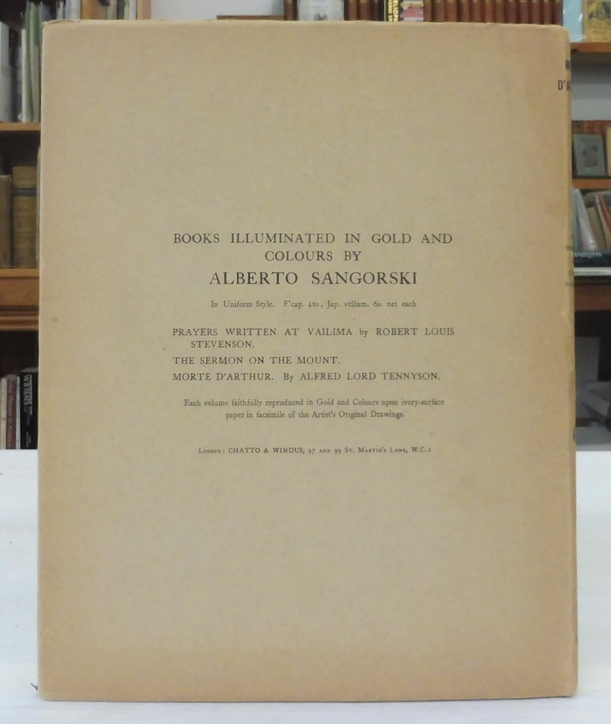 Morte D’Arthur, Tennyson, Alfred Lord; Illustrated and decorated by Alberto Sangorski. Published by Chatto & Windus, London, 1912. Parchment paper boards with red stylized title to front and spine; red top edge. Small 4to – over 9¾” – 12″ tall; 24pp., title page with coat-of-arms and a portrait of Tennyson; three full colour vignettes, colour decorative initials, borders, and illustrations; leaves are French-folded and unopened. Pastedown has a tasteful bookplate with 1932 date. Contents are otherwise in fine condition. Rubbing and a tiny pin hole to lower edge of front board; otherwise, boards are in fine condition and binding is tight. Dustjacket is in very good condition: toning, chip to head of spine, closed tears to edges a small area at lower corner shows top layer paper loss. A beautiful copy. Two additional Alberto Sangorski illuminated titles available: The Sermon on The Mount and Prayers Written at Vailima by Robert Louis Stevenson. Please enquire.