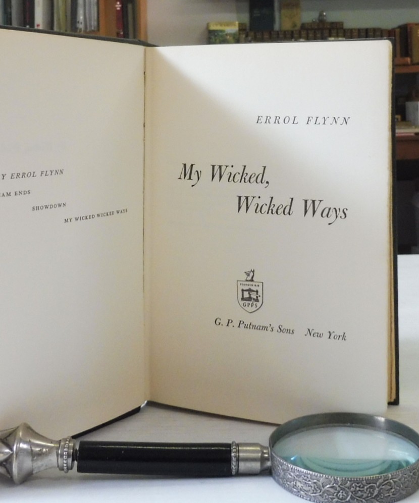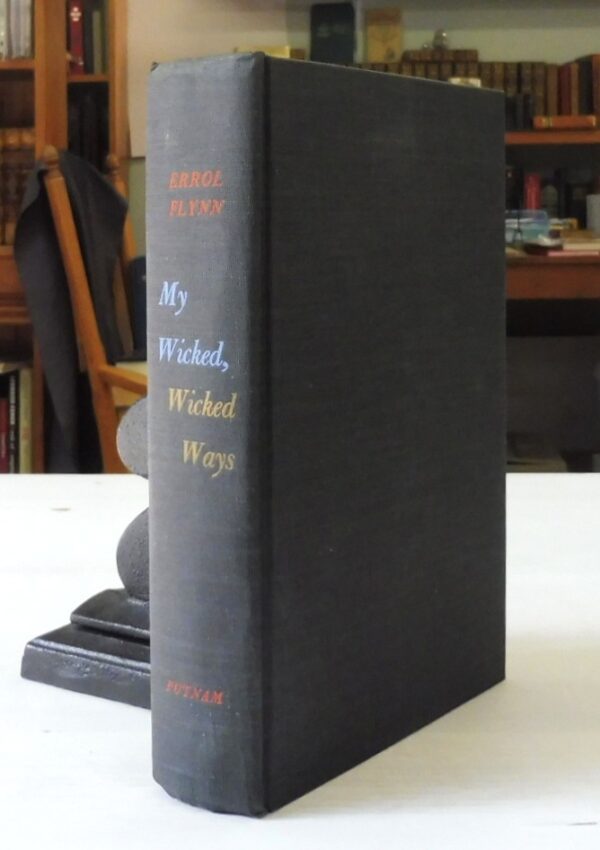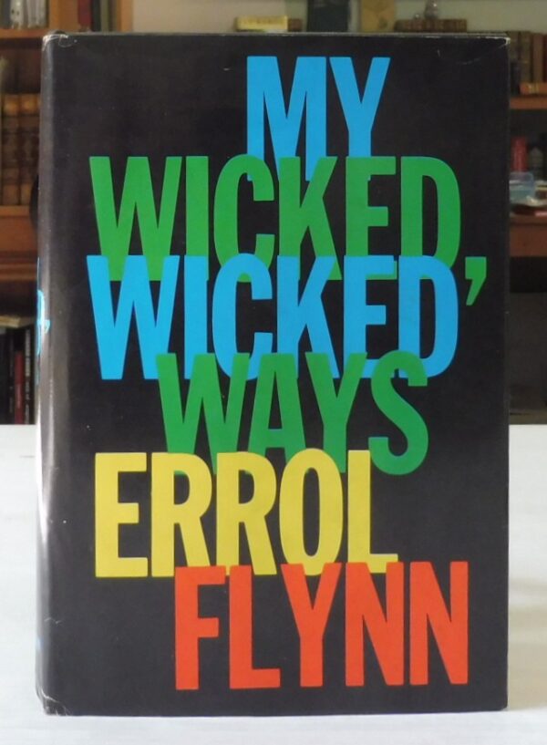 My Wicked, Wicked Ways, Errol Flynn. Published by G. P. Putnam’s Sons, 1959. First Edition. 8vo up to 9½” tall. 438pp. Black cloth boards with red, blue and yellow spine titles. Name and date of May 1969 to free endpaper and otherwise volume is free of markings, tears or folds. Dustjacket is clipped with inside residue tape marks, light creasing to spine tail and head and corner edges. A near fine copy of this scarce first edition.