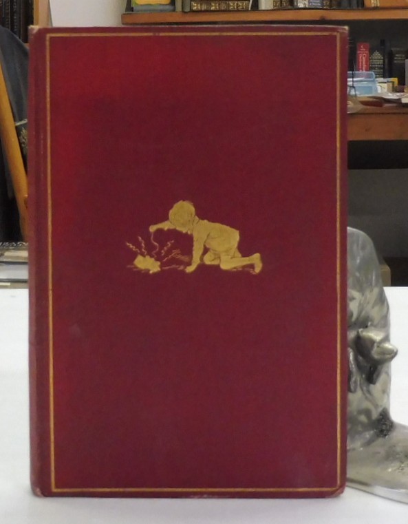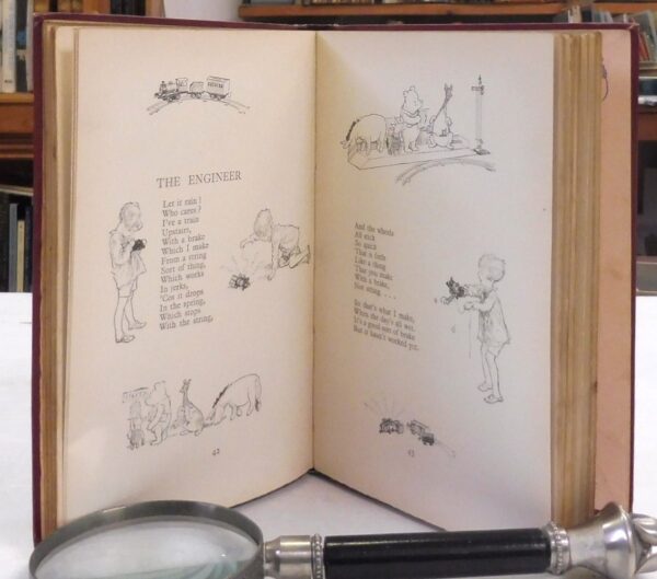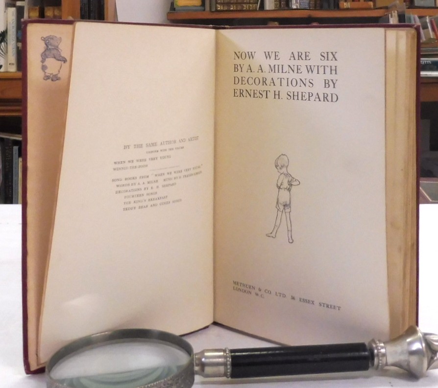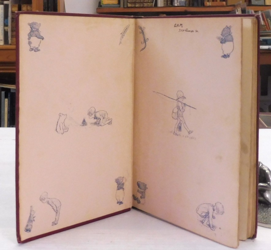 Now We Are Six, A. A. Milne; illustrations by E. H. Shepard. Published by Methuen & Co. Ltd., London, 1927. First Edition, First Printing. 12mo up to 8½” tall., 103pp. Crimson soft leather with gilt illustration of Christopher Robin to front board and an illustration of Winnie-the-Pooh and Piglet to rear cover; gilt spine titles; illustrated pink endpapers. Tiny name to free endpaper; offsetting to half title, an occasional light and small smudge mark; inner hinges very lightly weakened. Rear cover has light soiling, corners and tail and head of spine have light bumping; light fading to upper front cover. A lovely, collectible copy.