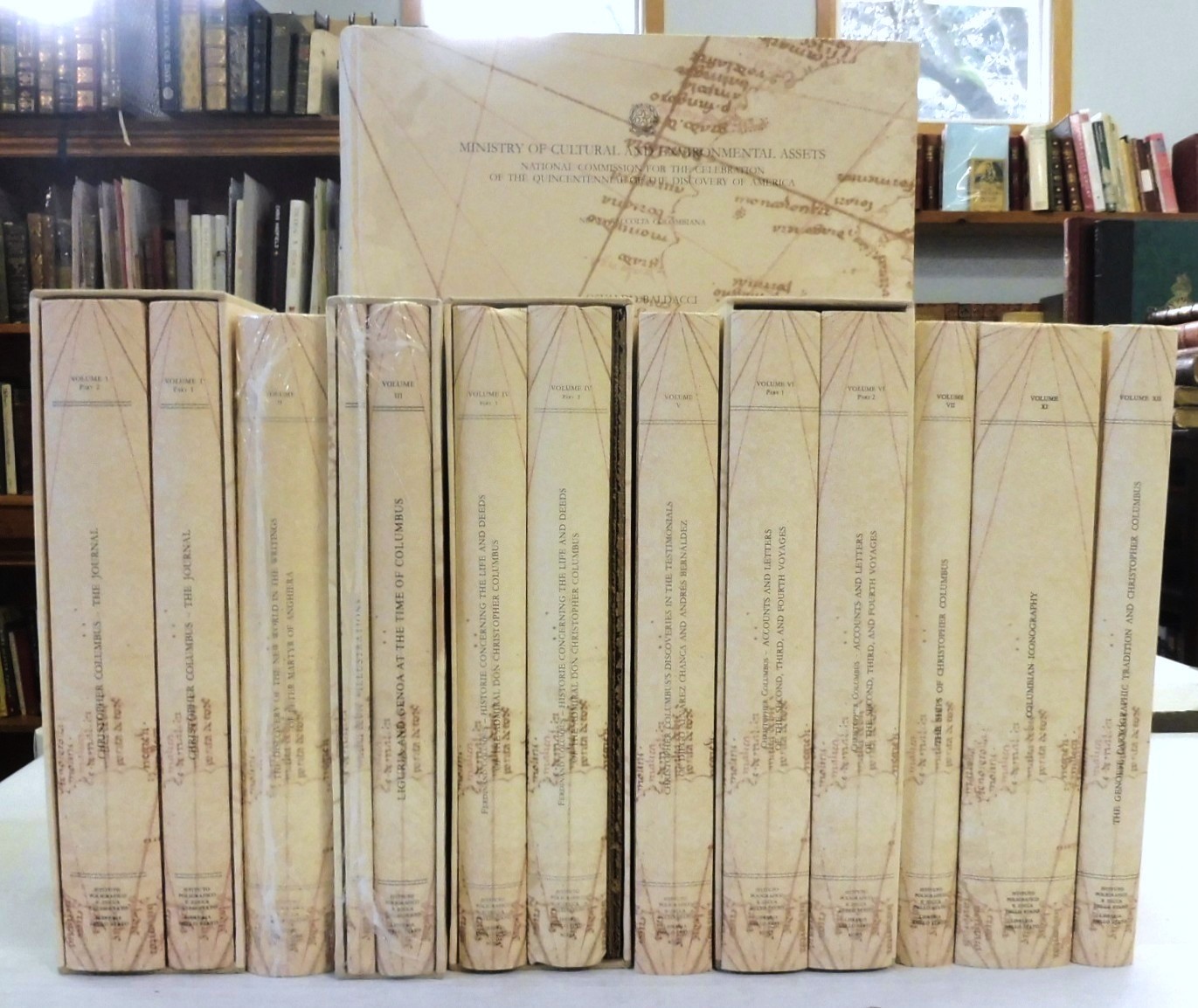 Nuova Raccolta Colombiana, Columbus, Christopher. English Edition. Published by Roma: Istituto Poligrafico E Zecca Dello Stato, Libreria Dello Stato, 1992-1999. Ministry of Cultural and Environmental Assets, National Commission for the Celebration of the Quincentennial of the Discovery of America. English Edition. Complete Set of Printed Books, Volumes I-VII, IX, XI-XII. 8vo up to 9½” tall. Pictorial boards. Volumes 1, 3, 4 & 6 are housed in linen-covered slipcases. Printed on special paper. Text in two columns. This beautiful set is as new with some volumes still in original wrapping.