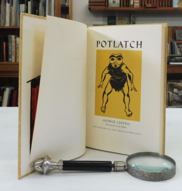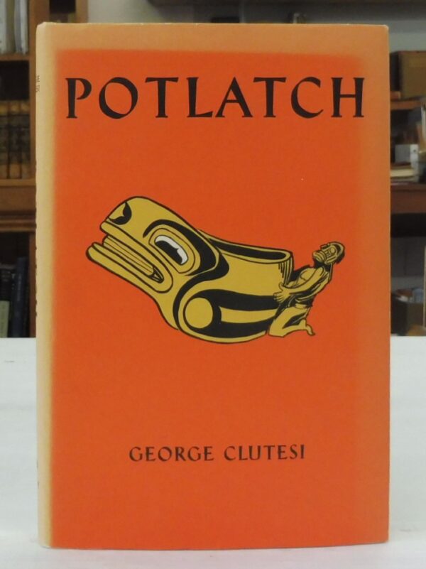 Potlatch, Clutesi, George. Published by Gray’s Publishing, Sidney, 1969. First Edition/First printing. 8vo up to 9½” tall. 188pp., Text and illustrations by George Clutesi. Beige boards with red spine titles, illustrated endpapers. Volume is in fine, unread condition. Dustjacket has fading to edges, light stain to upper spine and light edge wear.