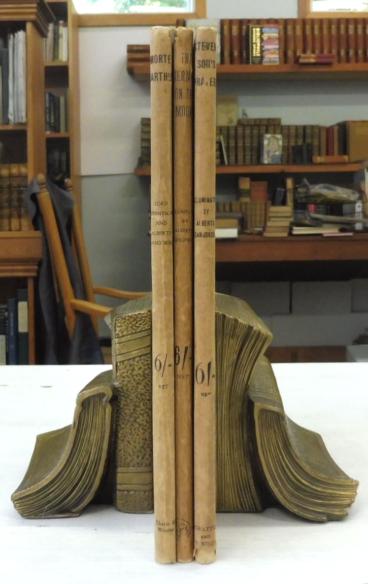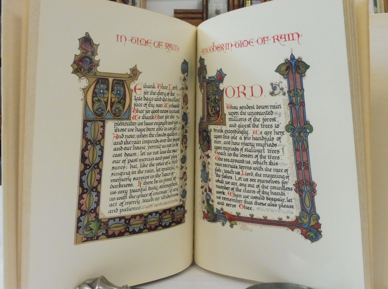 Prayers Written at Vailima, Stevenson, Robert Louis; Introduction by Mrs. R. L. Stevenson; Illustrated and decorated by Alberto Sangorski. Published by Chatto & Windus, London, 1928. Fourth Impression. Parchment paper boards with red stylized title; red top edge. Small 4to – over 9¾” – 12″ tall; 24pp., Title page in full colour with medallion portrait of Stevenson; colour and gilt decorative initials, and borders to each prayer; leaves are French-folded and unopened. Pastedown has a tasteful bookplate with 1932 date and other wise contents are in fine condition. Light rubbing to rear board near lower edge and otherwise boards are fine. Dustjacket has toning, split to center spine, tiny chips and closed tears to edges. A beautiful copy. Two additional Alberto Sangorski illuminated titles available: Morte D’Arthur, Tennyson, Alfred Lord and The Sermon on The Mount.