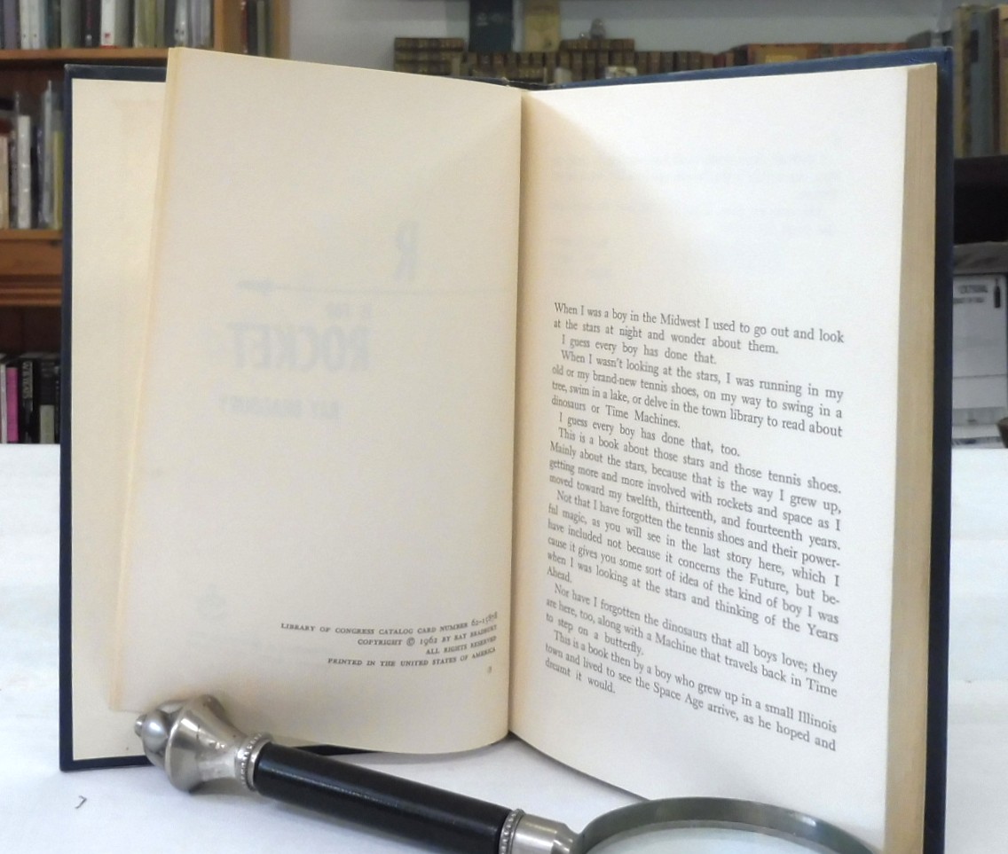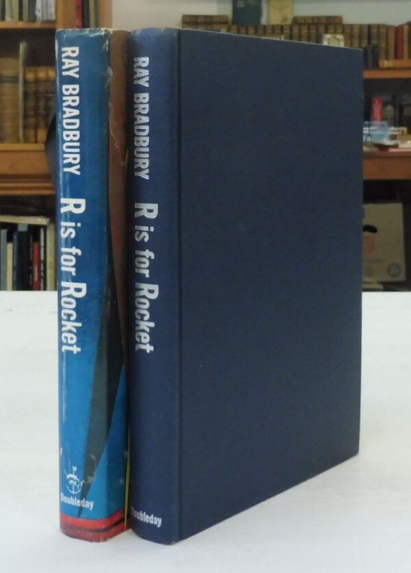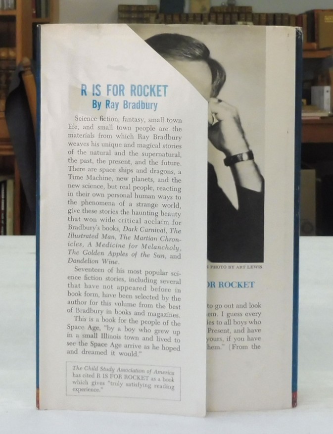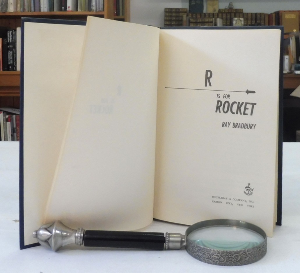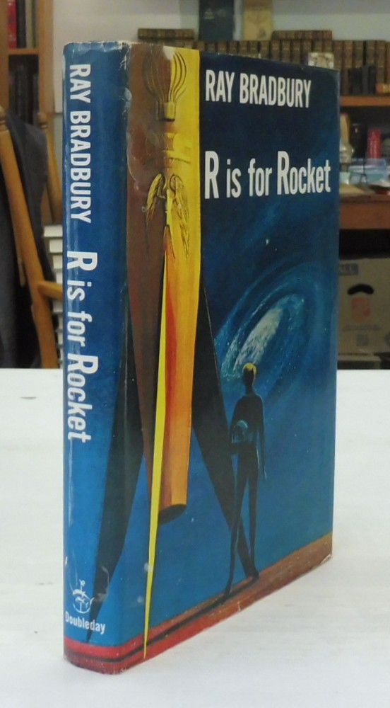 R is for Rocket, Ray Bradbury. Published by Doubleday & Co, New York, 1962. Early reprint from year of first edition publication. Likely intended for school libraries with a recommendation from The Child Study Association to bottom of front jacket flap. Code G52 inner margin of last page in text. 8vo up to 9½” tall., 233 pp. Navy boards with silver lettering on spine. Name to free endpaper and partial stamp to rear pastedown; contents are otherwise in fine condition with light rubbing to corners and head and tail of spine. Clipped jacket in very good condition with tape residue inside and light shelf wear.