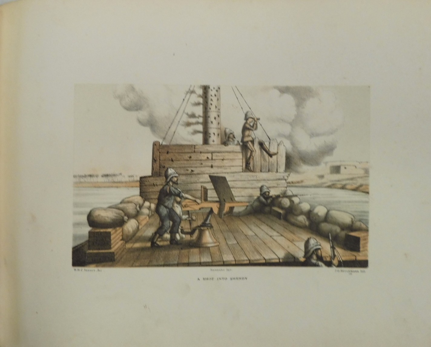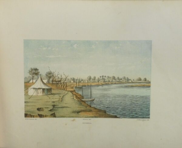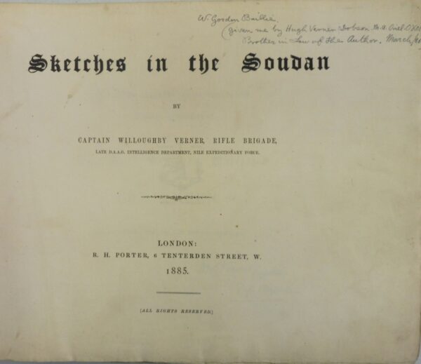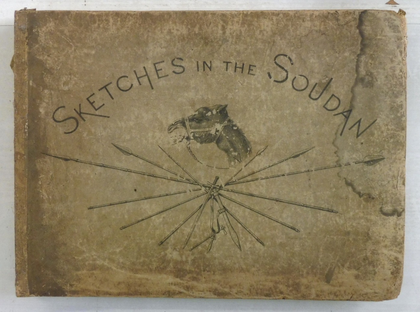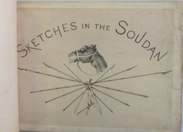 Sketches in the Soudan, Verner, Captain Willoughby. Published by R.H. Porter, 1895. First Edition. Presented to former owner by the brother-in-law of Captain Verner. Oblong Folio up to 15″ tall. List of subscribers, 39 chromolithograph plates with descriptions. Pictorial boards. Front board is detached. Plates are in very nice condition with occasional and light marginal foxing; one page has small closed tear to inner margin not affecting sketch.