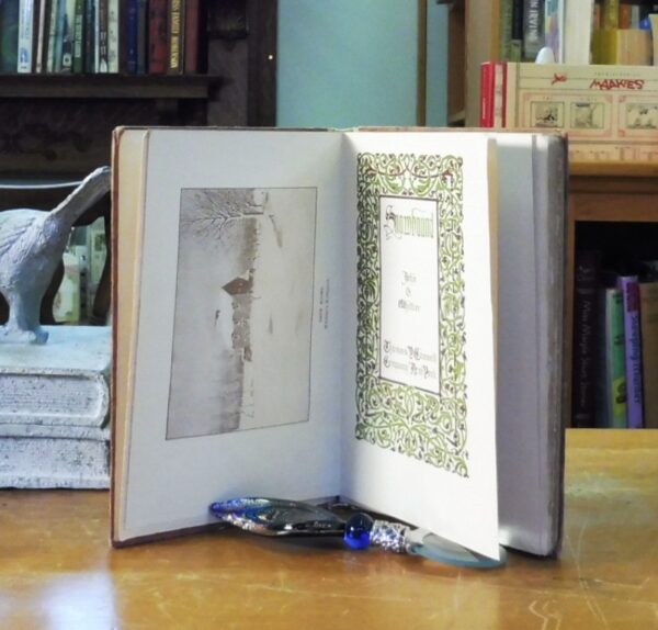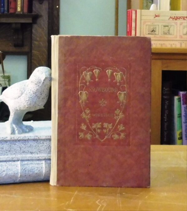 Snowbound, J.G. Whittier. Published by Thomas Y. Crowell Company Publishers., New York. America., Circa 1908. 12mo – over 6¾ – 7¾” tall. Rose-colored textured boards with Art Nouveau cover art in gilt; white spine, yapped corners; rough cut pages, gilt top edge. 66 pages. Frontispiece of Whittier’s birthplace. Title page decorated in green and mauve. 26 page introduction by Frances Campbell Sparhawk dated January 20, 1908. Pencilled inscription to free endpaper dated 1915. In lovely condition with light rubbing to corners; no tears, folds or marks and pages remain bright. 002107 $25