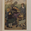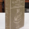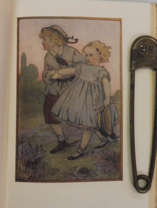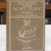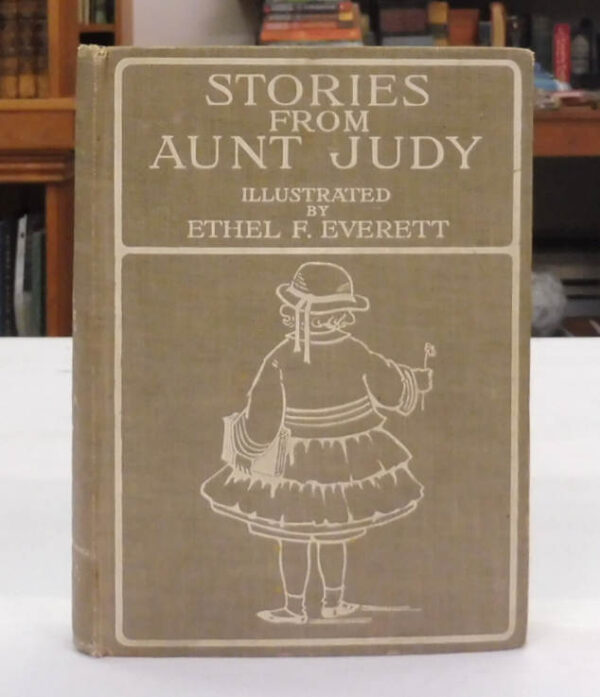 Stories From Aunt Judy, Published by G. Bell & Sons, London, 1913. Moss green cloth boards with white pictorial titles front and spine; rough cut edges, top edge gilt; gold reading ribbon. Endpapers illustrated with scenes from E.A. Rodd’s ‘Saramouches’ stories with front endpapers depicting ‘Scaramouches – good’; the back endpapers depicts ‘Scaramouches – naughty’. Eight charming full color plates (protected by preceding blank papers) and several additional black and white illustrations by Ethel Everett. Boards and binding in fine to near fine condition. Text block and plates in fine condition without marks and tears except for front free endpaper which has a Christmas postage stamp dated 1961 with a previous owners name and address in juvenile script.