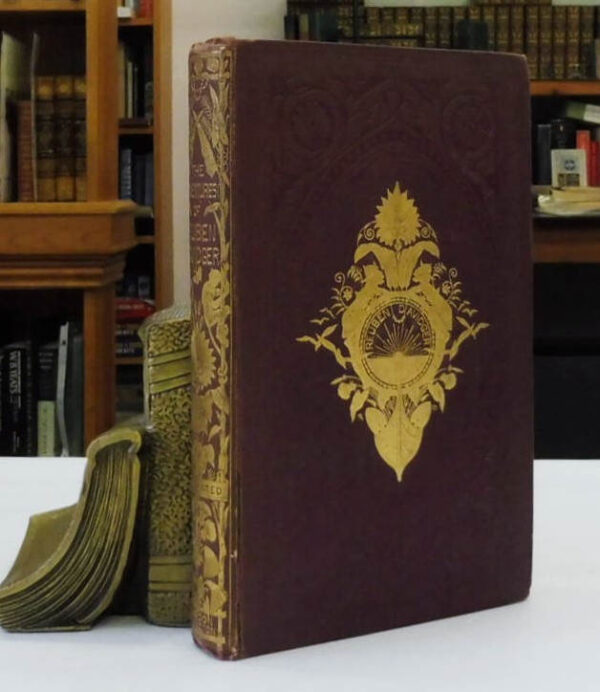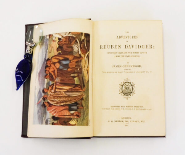 The Adventures of Reuben Davidger; Seventeen Years and Four Months Captive Among the Dyaks of Borneo, James Greenwood, S.O. Beeton, London., 1865. First edition. 8vo up to 9½” tall. pp [xii], 356. Numerous engravings including 8 plates on tinted paper. Original burgundy leather boards with elaborate scrolled design front, back and spine with gilt design and titles front and spine; all edges gilt, grey endpapers. An occasional tiny foxing mark and otherwise contents in fine condition without marks, tears or folds. Binding is tight and square. Very light rubbing to corner and spine edges with gilt remaining fine and bright. A beautiful copy.
