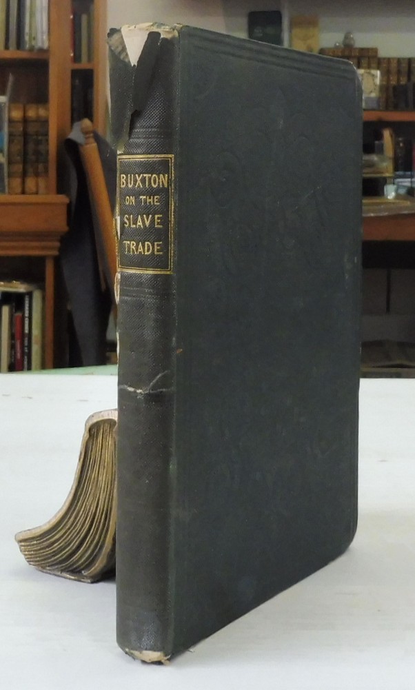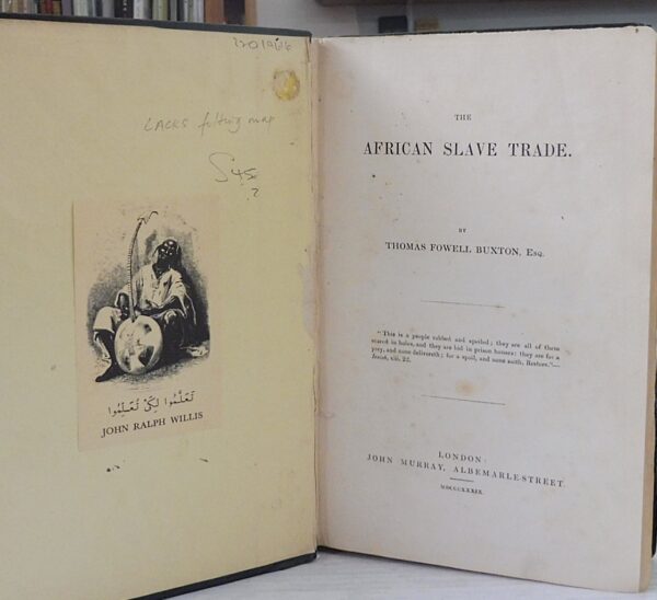 The African Slave Trade, Thomas Fowell Buxton. Published by John Murray, London, 1839. First Edition. 8vo up to 9½” tall. 240pp. lacks front free endpaper and map. Light spotting and otherwise contents are in clean unmarked condition. Back strip torn at top and split at joints (repairable); moderate wear to boards. In good condition. Bookplate of John Ralph Willis (1938-2007), a prominent African American educator and art collector.