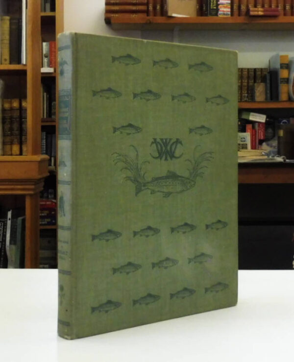 The Compleat Angler, or The Contemplative Man’s Recreation, Walton, Izaak and Cotton, Charles. Published by The Heritage Club, New York, 1938. Subtitled: Being a Discourse of Fish and Fishing for the perusal of Anglers, by Izaak Walton; With Instructions, How to Angle for a Trout or Grayling in a Clear Stream by Charles Cotton. 4to – over 9¾” – 12″ tall; xii,241pp. with drawings by Robert Ball. Green cloth with darker green fishes and lettering; top edge green; mapped endpapers. Heritage Sandglass insert Number 11A entitled Fish in Season, provides history of the angler and author; detailed information on the art, type etc. of volume. Contents are in fine, unmarked condition. Boards have light edge rubbing, two small bumps, light outer edge dusting and a light fade spot to front board; binding is tight and square. Sandglass newsletter has small stain.