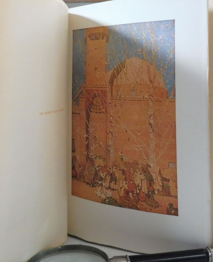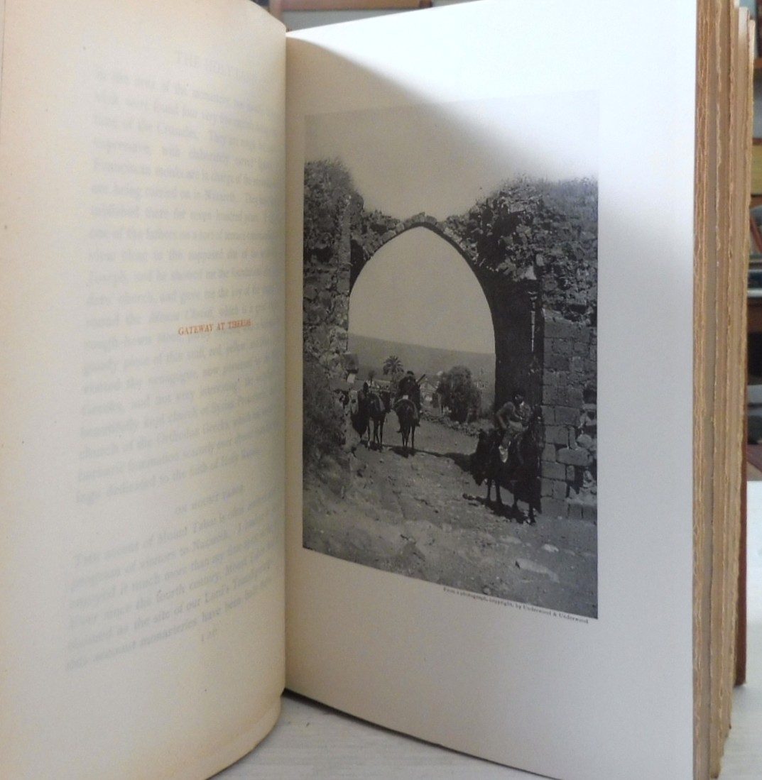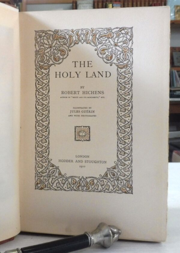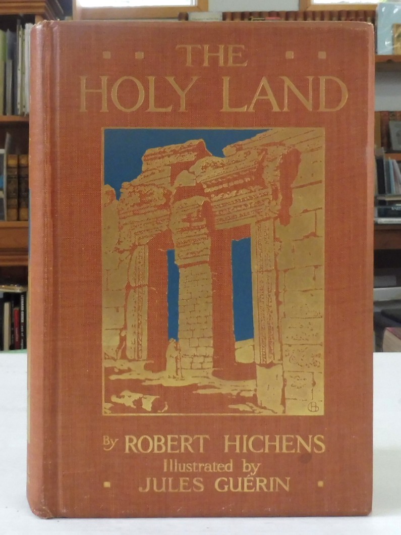 The Holy Land, Hichens, Robert. Illustrated by Jules Guerin. Published by Hodder & Stoughton, London, 1910. First Edition. 8vo up to 9½” tall, 302pp., frontispiece, colour plates from paintings by Guerin, photographs. Pictorial cloth boards, top edge gilt, rough cut edges. Moderate wear to boards, contents in fine condition