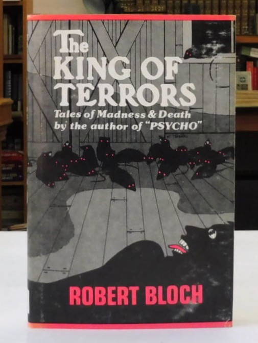 The King of Terrors, Bloch, Robert. Published by Mysterious Press, New York, 1977. Second printing. 8vo up to 9½” tall., 212pp. Black boards with gilt spine titles, red endpapers. Volume is in fine, unmarked condition; unclipped jacket is in fine condition with the lightest of fading. Contains fourteen horror stories.
