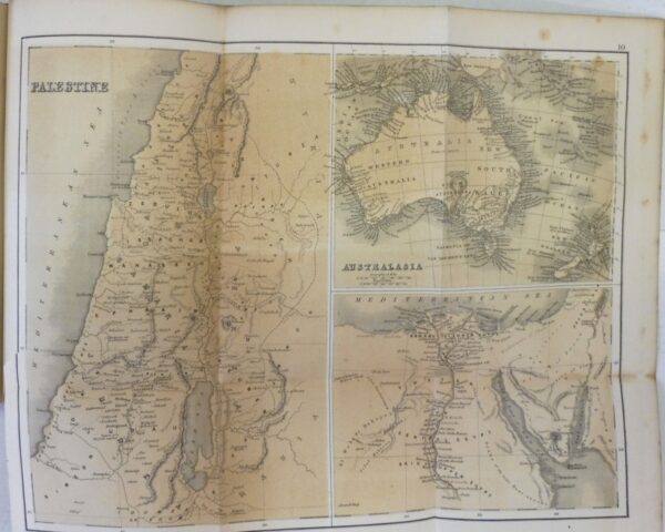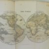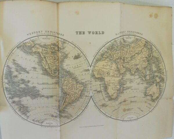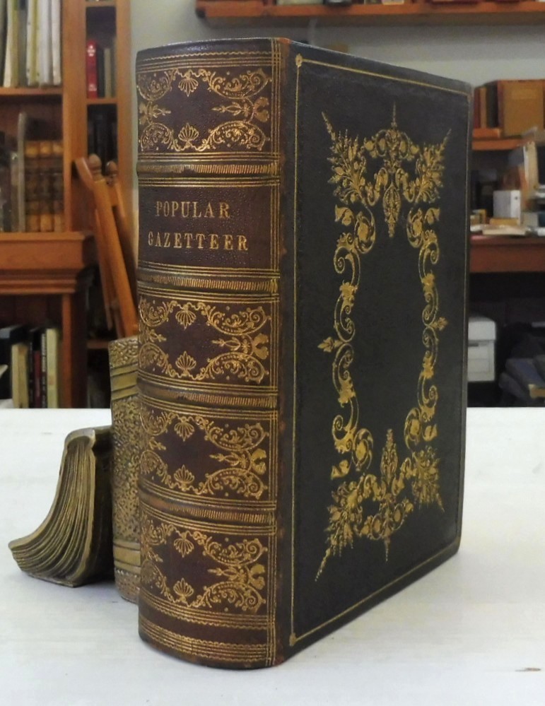 The Library Gazetteer; or Dictionary of Descriptive and Physical Geography, James Bryce. Published by Richard Griffin and Company, London and Glasgow, 1859. 8vo up to 9½” tall. xlviii., 823pp. with ten folding colour maps. Black pebbled boards with elaborate gilt design; spine in brown leather, panelled with gilt titles and designs; dentelle edges; all edge gilt. Sporadic and light foxing; a few maps have closed tears along inner hinges; contents are otherwise, fine. Boards have very light wear with rubbing along hinge.