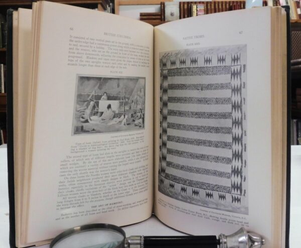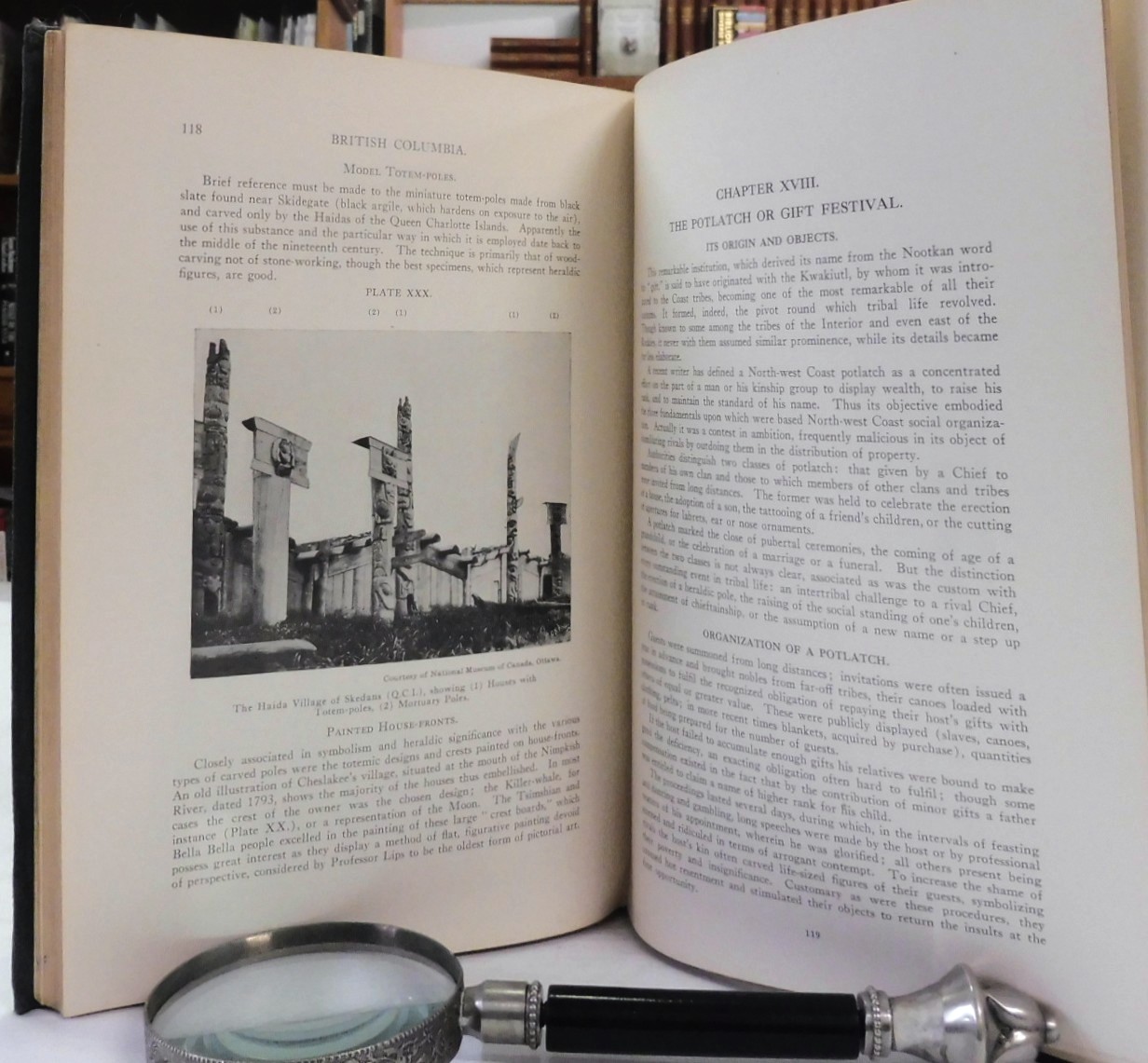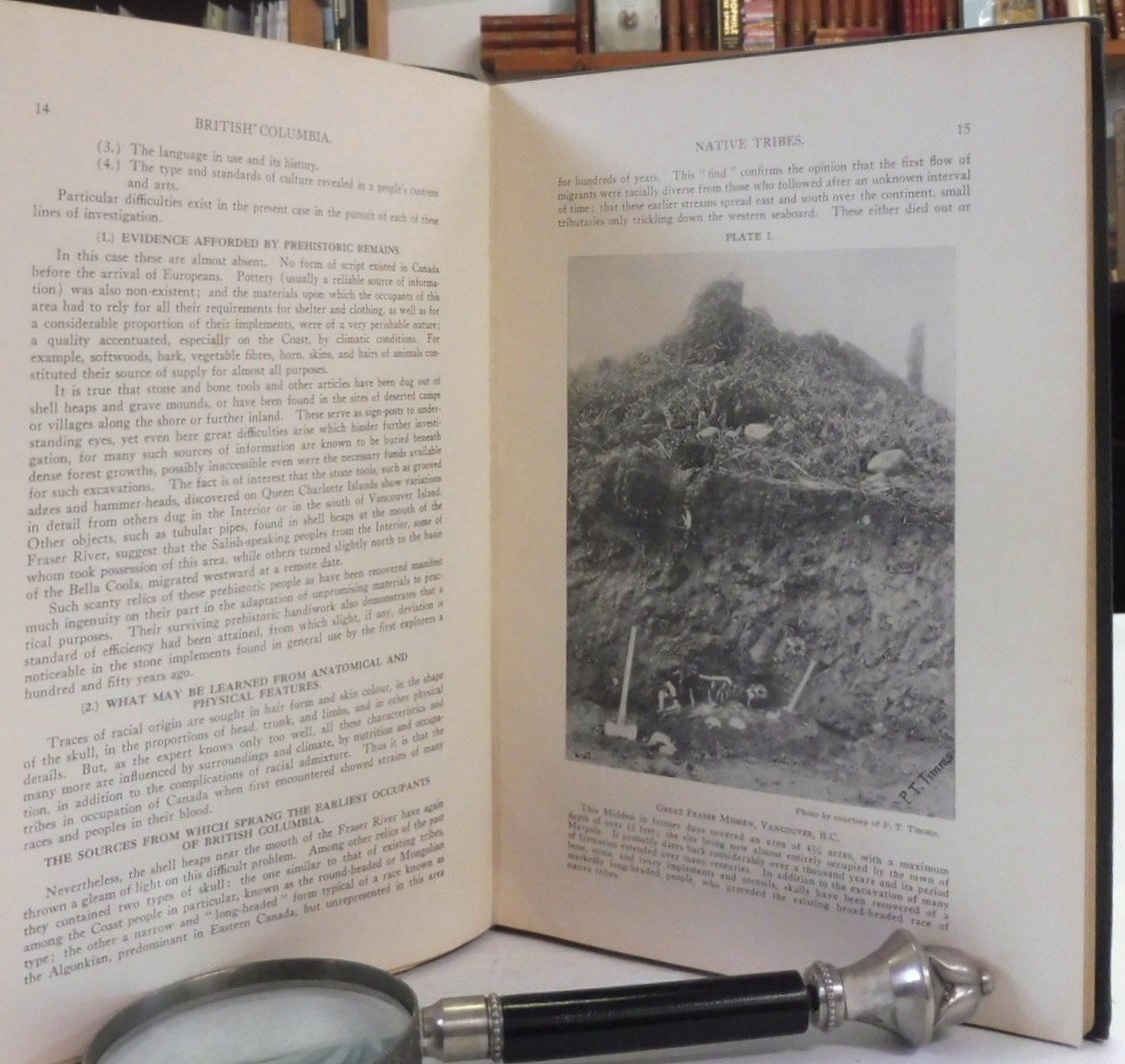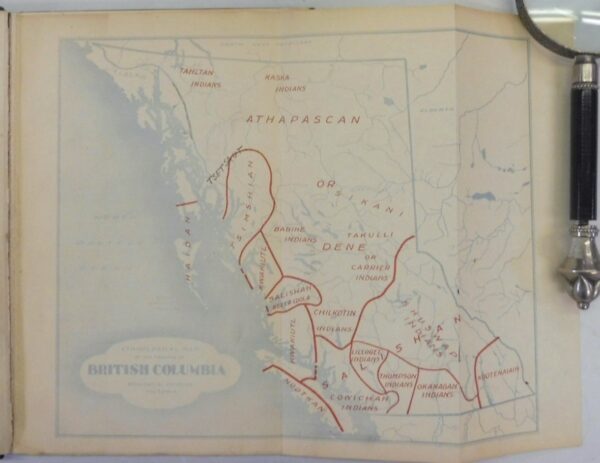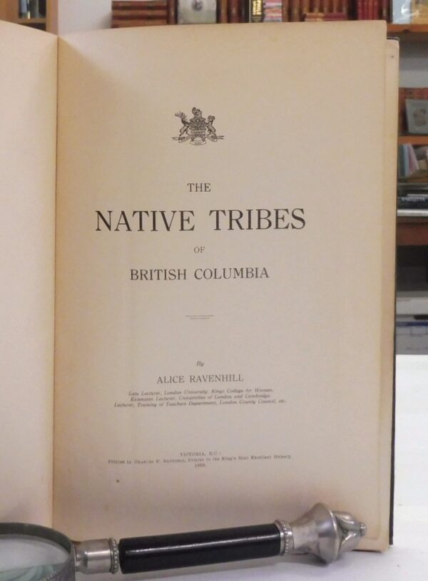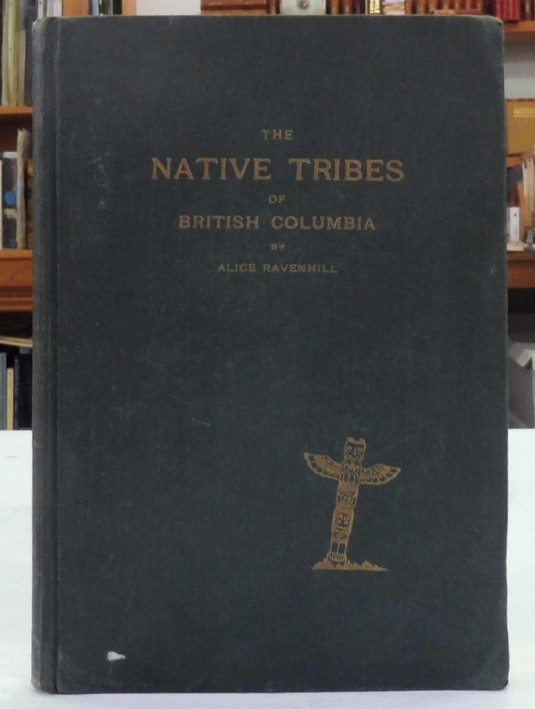 The Native Tribes of British Columbia, Ravenhill, Alice. Published by Published by Government of British Columbia, Victoria, B.C., 1938. Printed by Charles F. Banfield, Printer to the King’s Most Excellent Majesty. First Edition. 8vo up to 9½” tall., 142 pp. folding ethnological map, 35 photo plates, bibliography. Green cloth boards with gilt titles and totem pole to front, yapped edges, sewn binding, glossy pages. Inner lower front hinge weakened, inked note and name to free endpaper, very light toning and otherwise contents are in fine condition. Boards are straight and square, bumping to lower front cover, very light shelf wear. In very good condition.