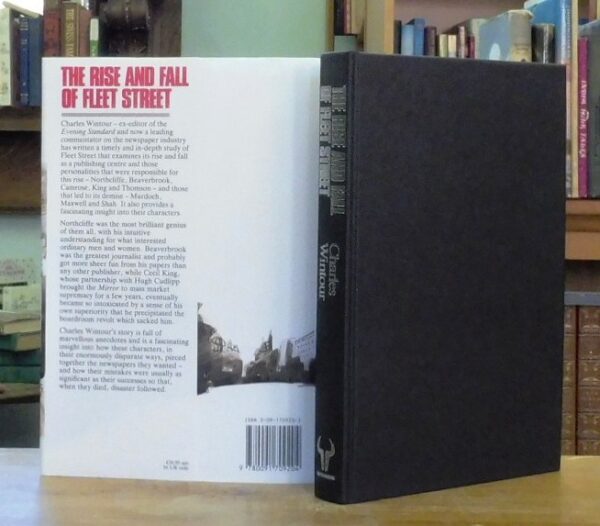 The Rise and Fall of Fleet Street, Charles Wintour, Hutchinson, London, 1989. First Edition. 8vo 8″ – 9″ tall; 271 pages including index, appendix and illustrations. Black boards, silver spine titles, red endpapers. Unclipped jacket and volume in fine condition. By the author of “Pressures on the Press”, this book examines the rise and fall of Fleet Street as a publishing centre. It looks at those who were responsible for the rise – Northcliffe, Beaverbrook, Camrose, Cudlipp and Kemsley – and those that led to its demise – Shah, Maxwell and Murdoch. 002437 $15