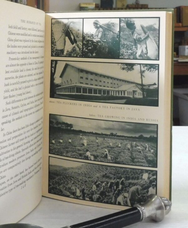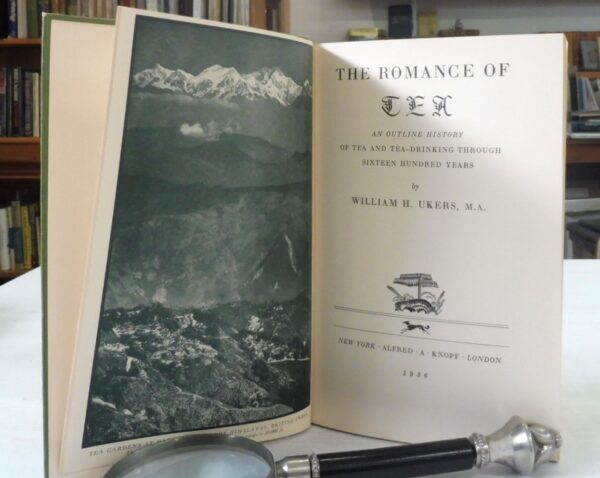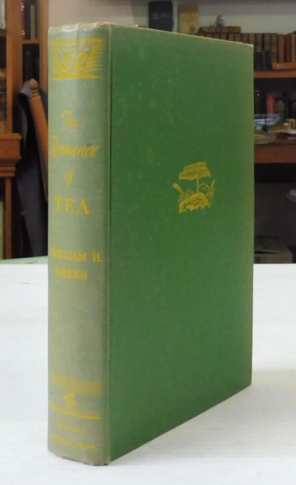The Romance of Tea: An Outline History of Tea and Tea-Drinking Through Sixteen Hundred Years, William H. Ukers. Published by Alfred A Knopf, New York & London, 1936. First Edition. 8vo up to 9½” tall., xiv 276 with 58 illustrations and photographs. Green cloth boards with gilt illustration to front, gilt spine titles. Pencilled notes to free endpaper; small area of printer’s ink to outside lower edge and otherwise contents are in fine condition. Fading to upper edge of rear board; light fading to boards; very light lean of spine. Lacking dustjacket.