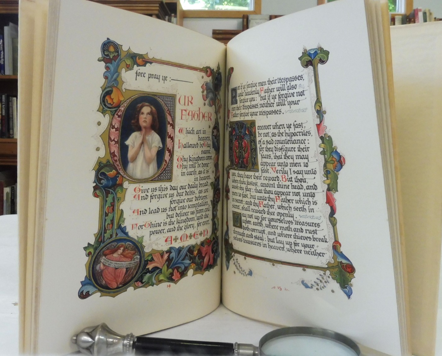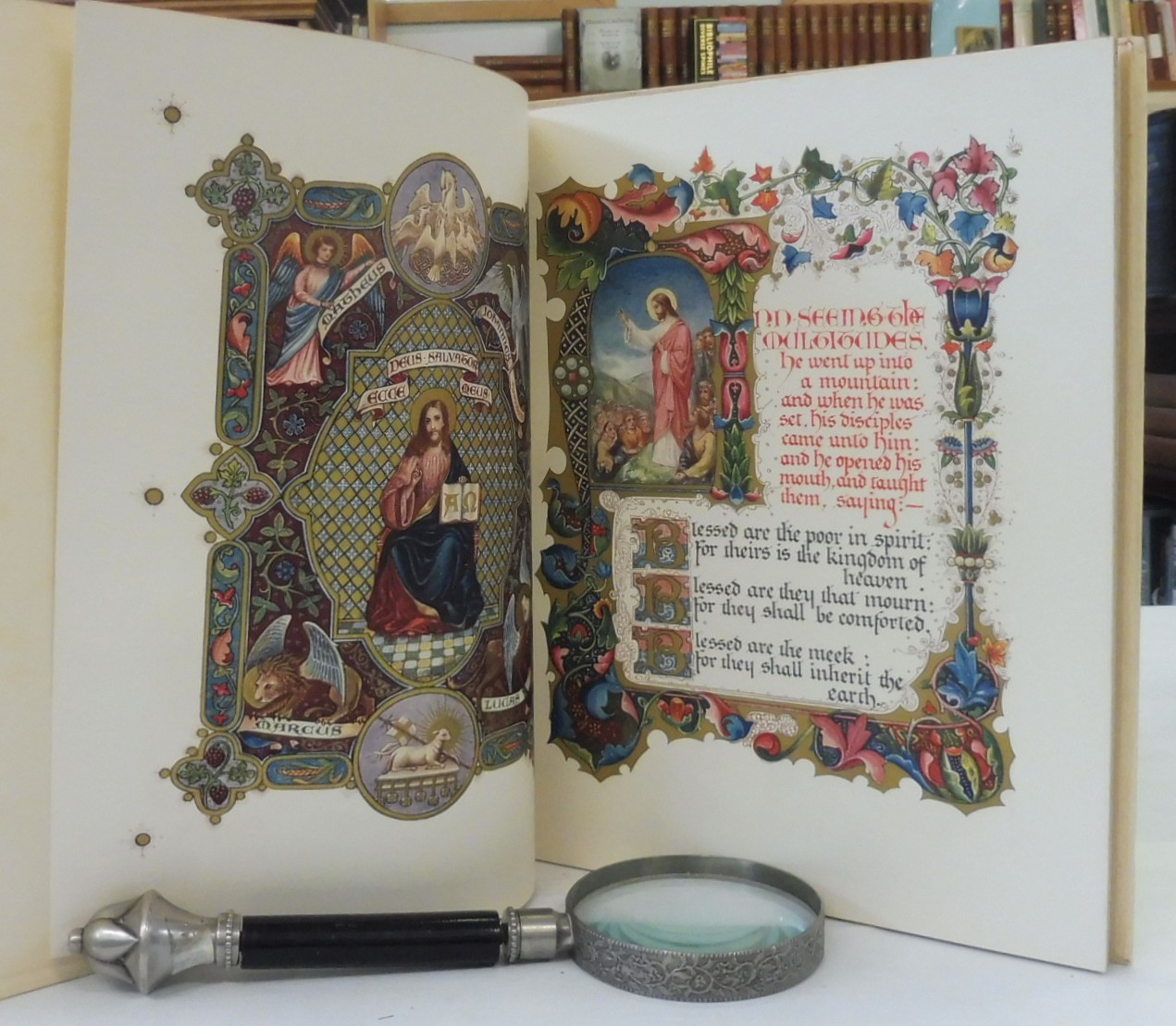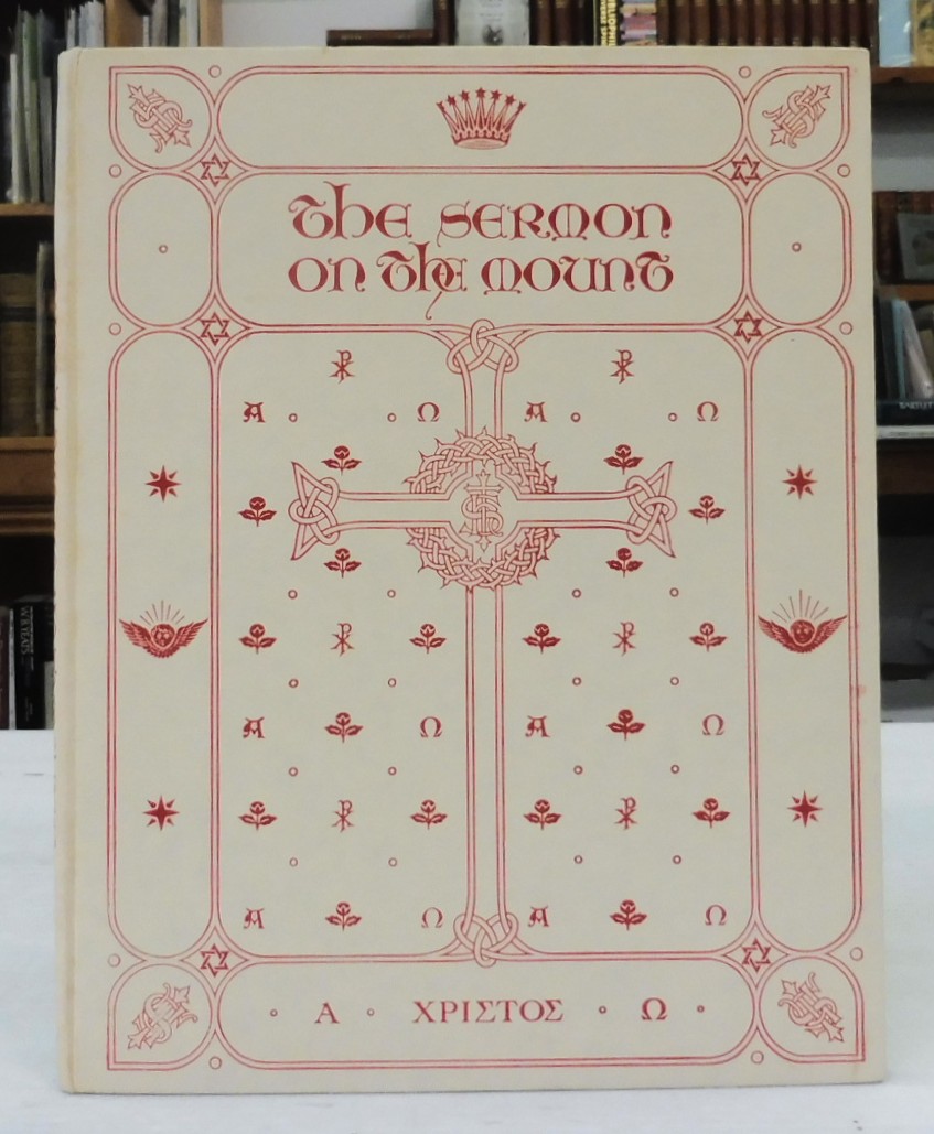 The Sermon on The Mount Illustrated and decorated by Alberto Sangorski. Published by Chatto & Windus, London, 1911. Printed without rear colophon. Parchment paper boards with stylized titles, red cross and iconographic borders and motifs to front; red top edge. Small 4to – over 9¾” – 12″ tall; 24pp., title page with full colour and gilt medallion portraits of religious icons; two full colour vignettes, colour and gilt decorative initials, borders, and medallion portraits on each page; leaves are French-folded and unopened. Pastedown has a tasteful bookplate with 1932 date. Front hinge is lightly weakened and otherwise contents are in fine condition. Tiny rub to head of spine and otherwise boards are in fine condition. Dustjacket has toning, split to lower center spine fold with chip to head and tail of spine. A beautiful copy.