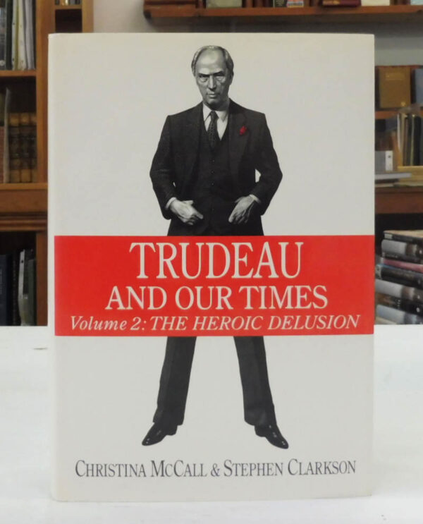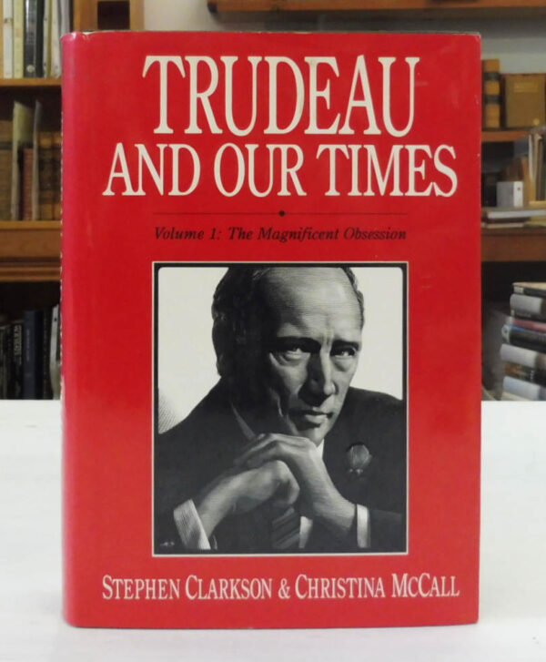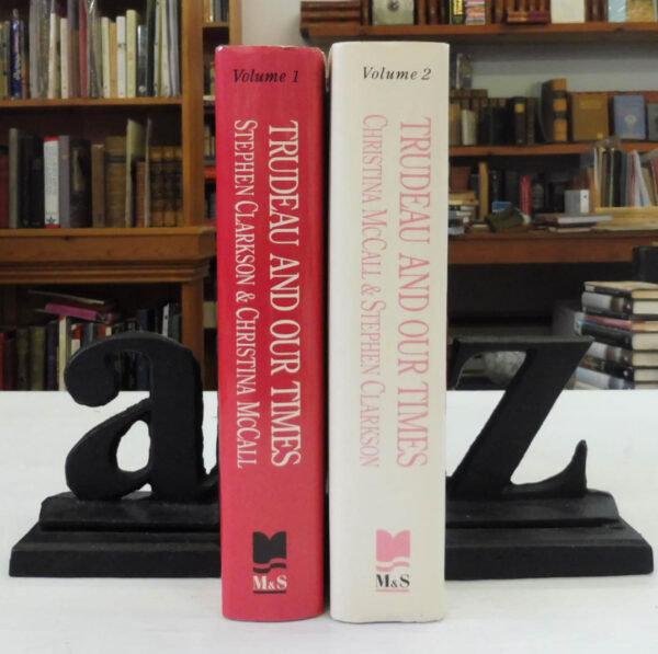 Trudeau and Our Times. Volume I: The Magnificent Obsession. Volume II: The Heroic Delusion, Clarkson, Stephen & McCall, Christina. Published by McClelland and Stewart Inc., Toronto, 1990; 1994. First Editions. Signed on title pages by each author to each book. 8vo up to 9½” tall. Volume I: 502pp. with Afterword, Appendix, Notes, Bibliography, List of Interviews, Acknowledgments, Index. Volume II: 588pp. with Notes, Bibliography, List of Interviews, Acknowledgments, Index. Black boards with red gilt spine titles. Fading and edge wear to spine of dustjackets; otherwise, this set is in fine condition
