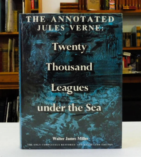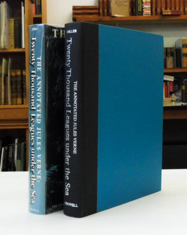 The Annotated Jules Verne: Twenty Thousand Leagues Under the Sea, Verne, Jules; Miller, Walter James (Editor). Published by Thomas Y. Crowell, NY, 1976. First Edition. 4to – over 9¾” – 12″ tall; 362pp., 150 illustrations, bibliography, and index. Quarter black cloth over blue coated boards, silver spine titles. Outer top edge has spotting; volume is otherwise in fine, unmarked condition; dustjacket has light edge wear and is protected in mylar.